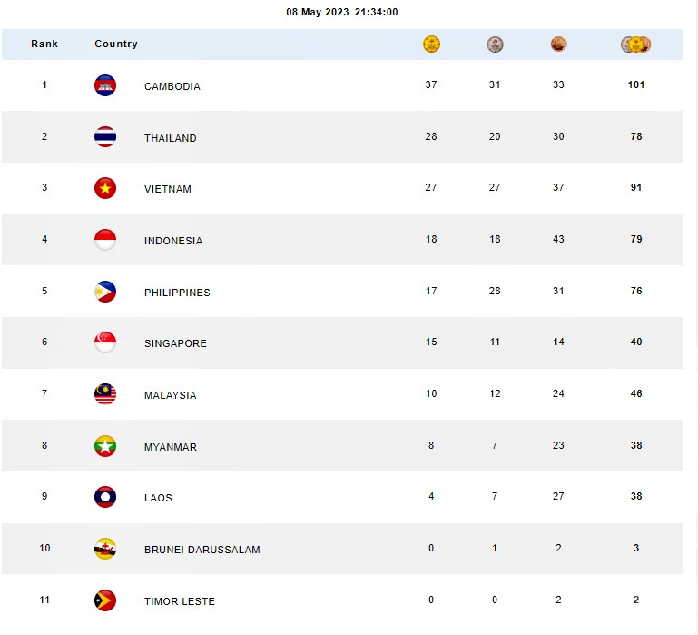 Bảng tổng sắp huy chương SEA Games 32 hôm nay 8/5 (cập nhật)