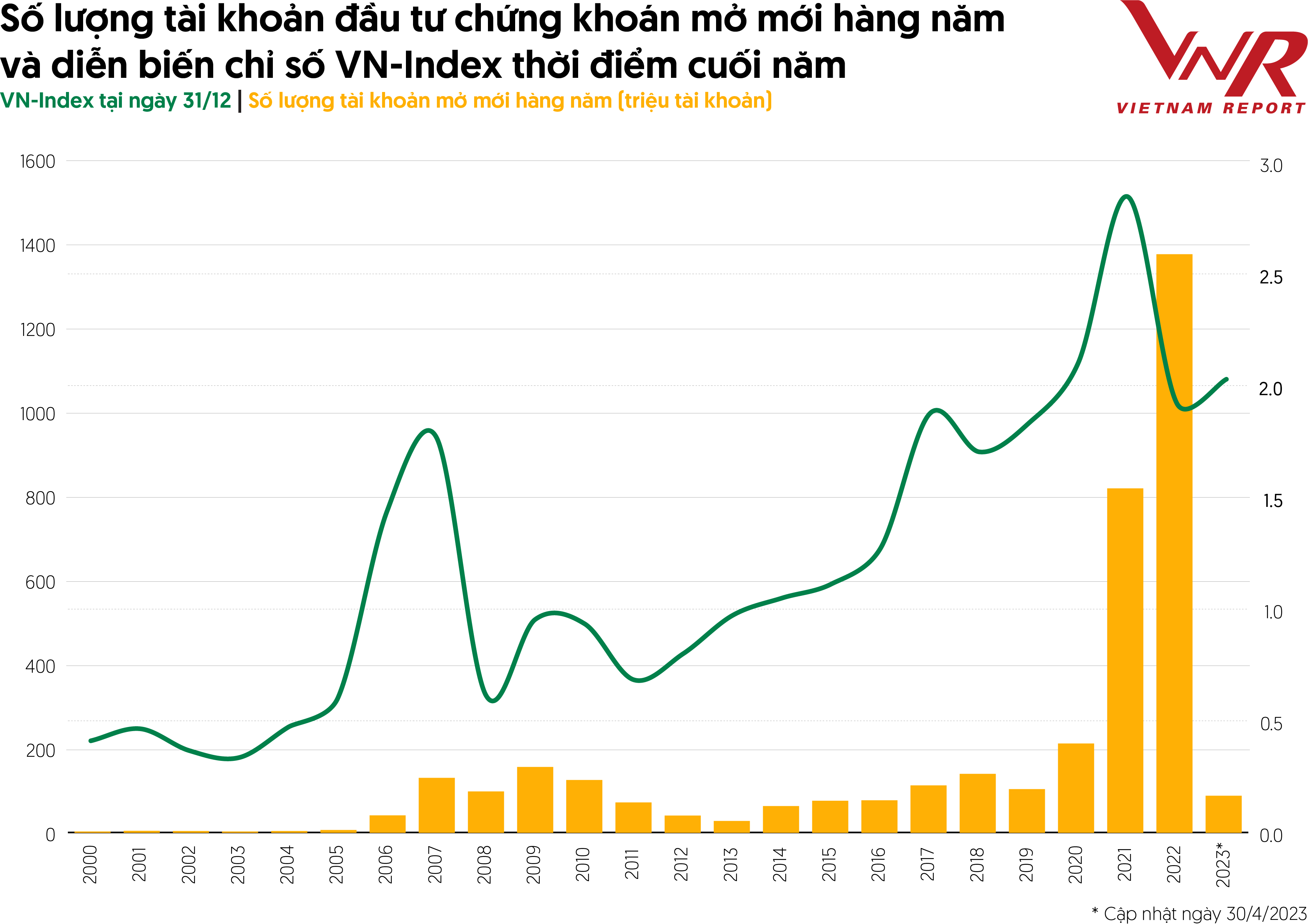 Mặc dù trải qua sự sụt giảm mạnh nhất trong 14 năm trở lại đây, TTCK Việt Nam vẫn có những điểm sáng trong năm qua khi ghi nhận kỷ lục về số lượng nhà đầu tư mở tài khoản mới, mức định giá thị trường ở vùng thấp trong nhiều năm mở ra cơ hội đầu tư cho các nhà đầu tư dài hạn, khối ngoại mua ròng mạnh mẽ từ nửa cuối quý IV/2022 đã giúp chỉ số hồi phục và tạo đà tâm lý cho thị trường quý I/2023.