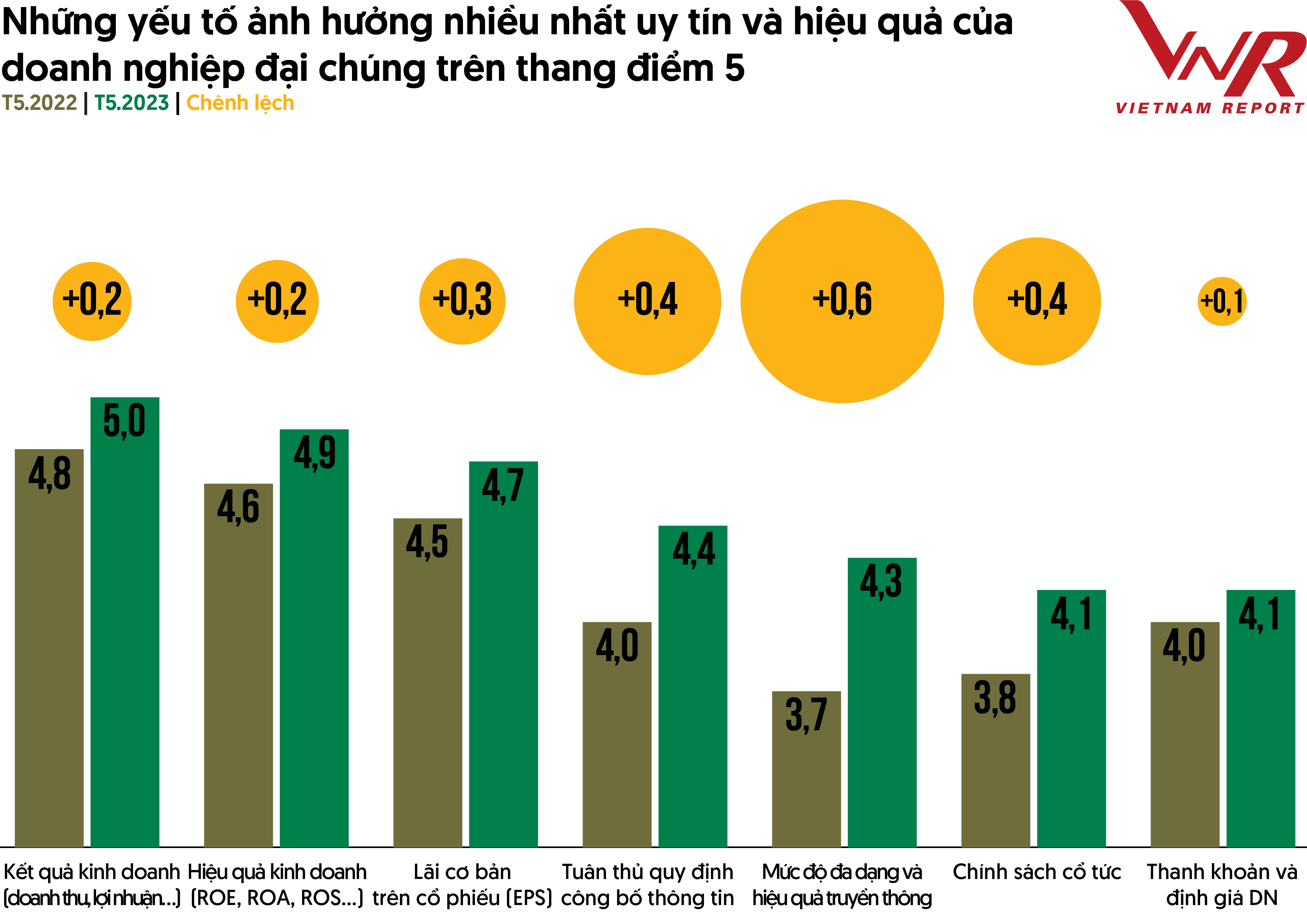 Cả 4 yếu tố liên quan đến chỉ tiêu năng lực tài chính: Kết quả kinh doanh, Hiệu quả kinh doanh, Lãi cơ bản trên cổ phiếu, Thanh khoản và định giá doanh nghiệp đều góp mặt trong top 7 yếu tố ảnh hưởng nhiều nhất đến uy tín và hiệu quả của doanh nghiệp đại chúng năm nay và ghi nhận sự gia tăng mức độ ảnh hưởng. Đáng chú ý, Chính sách cổ tức (gắn liền với quản trị doanh nghiệp) đã vươn lên từ vị trí thứ 8 năm ngoái trở thành yếu tố ảnh hưởng lớn thứ 6.
