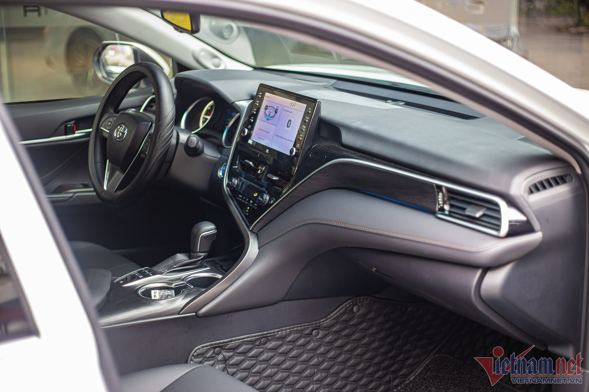 Bên trong khoang nội thất mang phong cách trẻ trung của thế hệ Camry mới, cùng tông màu đen chủ đạo. Xe còn mới đến mức một số chi tiết chưa bóc ni-lông chờ chủ nhân mới. Các tiện nghi trong xe bao gồm màn hình giải trí trung tâm kích thước 9 inch, hệ thống âm thanh JBL 9 loa, 4 ghế chỉnh điện, rèm che nắng cho hàng ghế sau, sạc không dây, cửa sổ trời,…