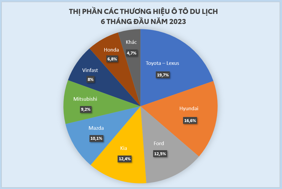 Với doanh số bán hàng kể từ đầu năm, Toyota đóng góp lớn vào sự thành công của sản lượng tiêu thụ ô tô du lịch 6 tháng đầu năm 2023 tại Việt Nam khi chiếm 19,7% thị phần thị trường.