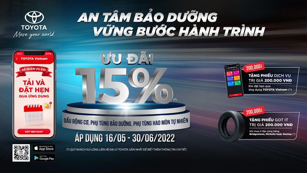 Từ 16/5 - 30/6/2022, khách hàng đặt lịch bảo dưỡng qua ứng dụng Toyota Vietnam để nhận ngay loạt ưu đãi và quà tặng hấp dẫn từ chương trình ưu đãi dịch vụ “An tâm bảo dưỡng - Vững bước hành trình” của Toyota.