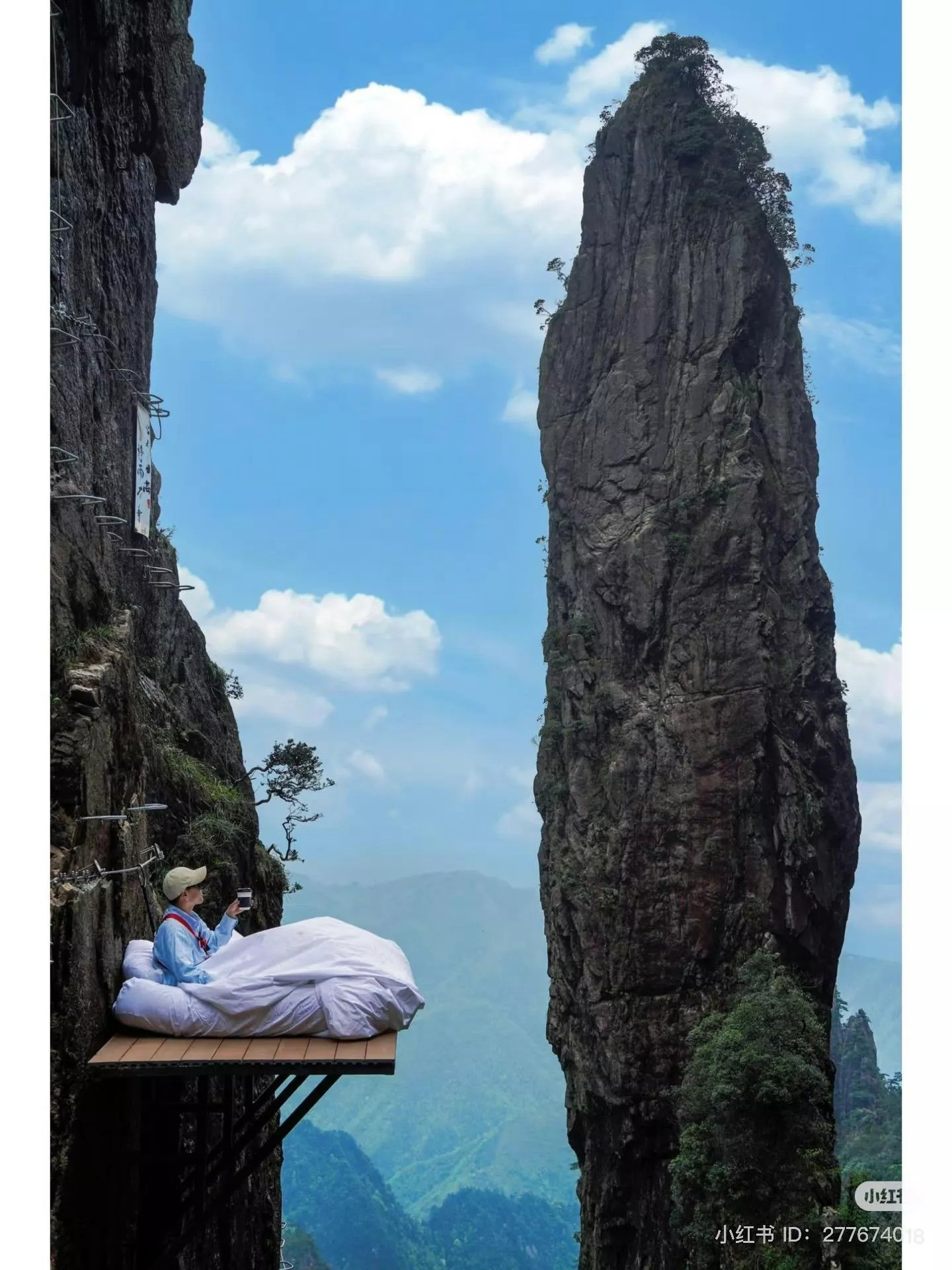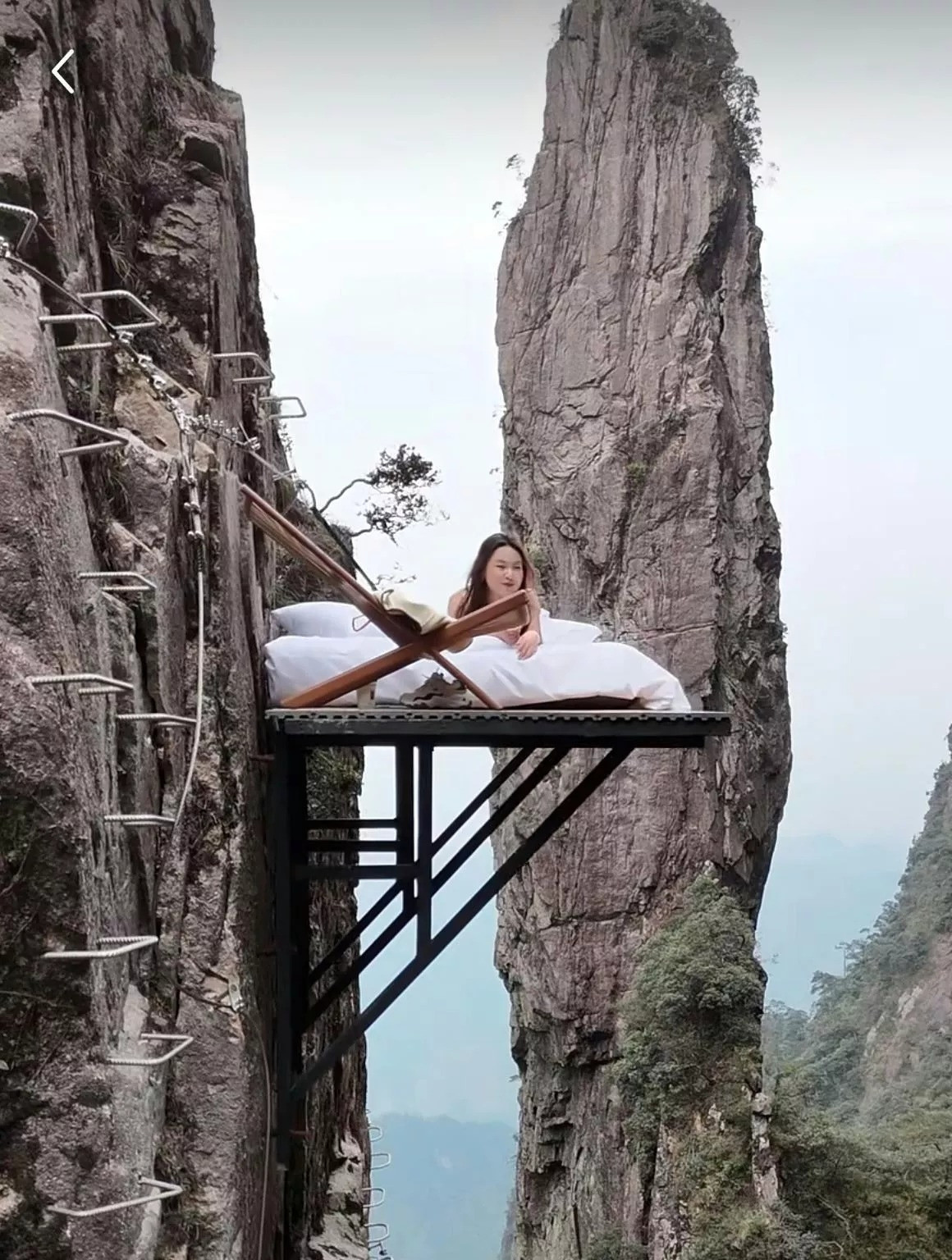 Những hình ảnh được chia sẻ trên mạng xã hội cho thấy chiếc giường ngủ được treo lơ lửng giữa không trung có đệm và chăn gối đầy đủ. Dù vách đá này có độ cao 1.600m so với mực nước biển, song vị trí thực tế của chiếc giường chỉ cách mặt đất khoảng 100m.