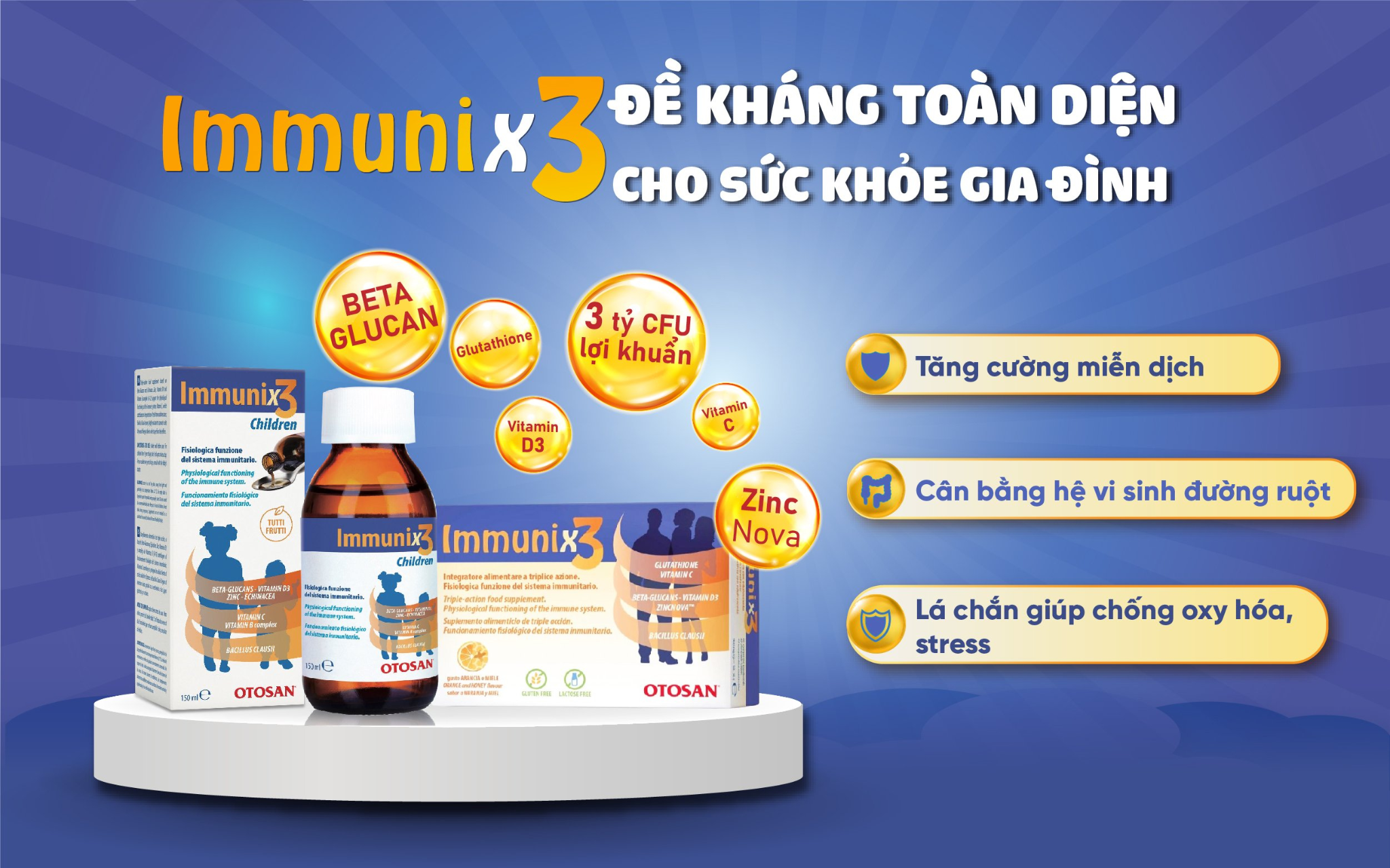 Ngoài dạng siro, Otosan còn mang đến TPBVSK Immunix3 dưới dạng viên nhai, vị cam mật ong, phù hợp cho thanh thiếu niên và người lớn. Sản phẩm chứa nhiều vi chất như: vitamin C, Beta-glucan, kẽm, Vitamin D3 kết hợp cùng 3 tỷ bào tử lợi khuẩn Bacillus Clausii... giúp cả nhà khỏe mạnh, tăng đề kháng.