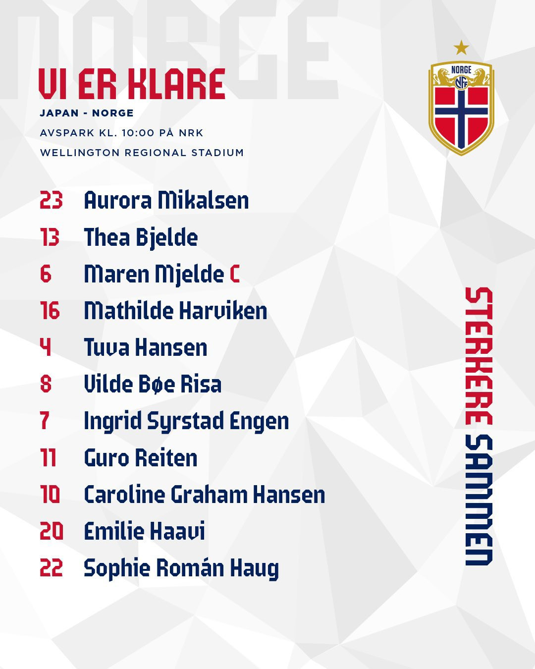 Nữ Na Uy (4-3-3): Mikalsen; Bjelde, Mjelde, Harviken, Hansen; Engen, Boe Risa, Reiten; Graham Hansen, Haavi, Haug.