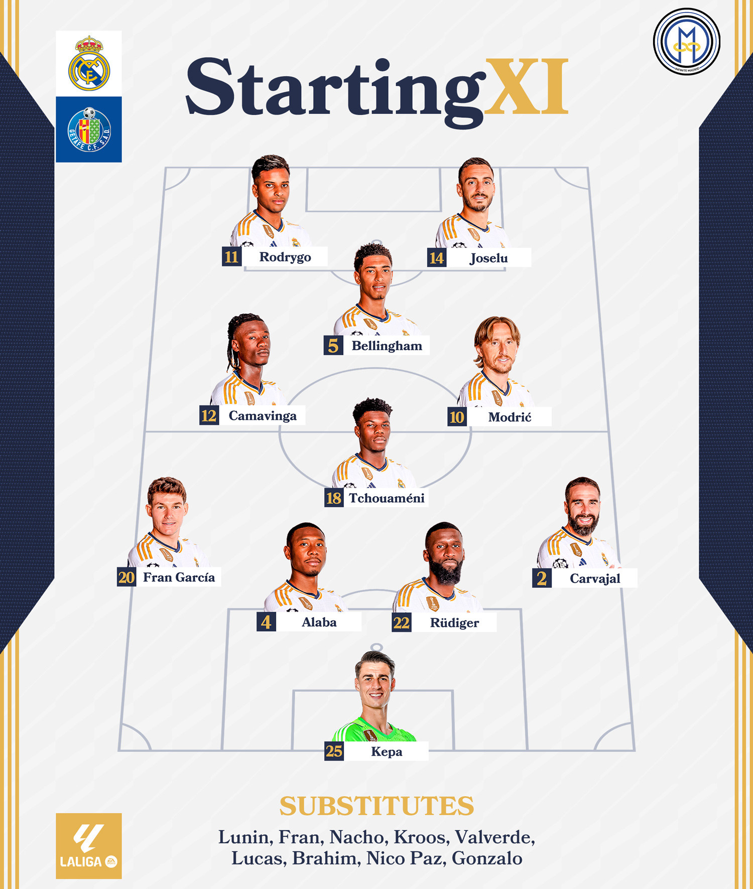 Real Madrid (4-3-1-2): Kepa; Carvajal, Rudiger, Alaba, Fran Garcia; Modric, Tchouameni, Camavinga; Bellingham; Joselu, Rodrygo.