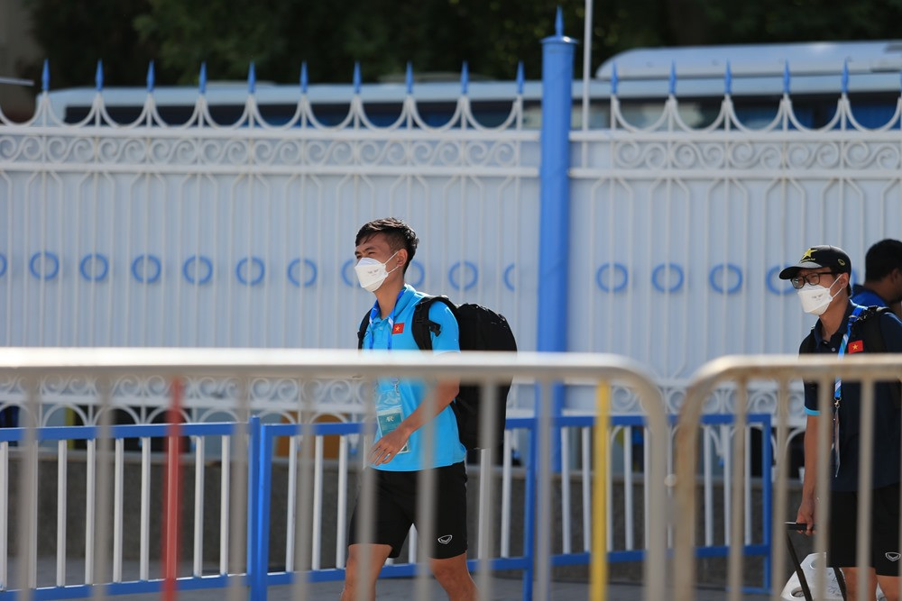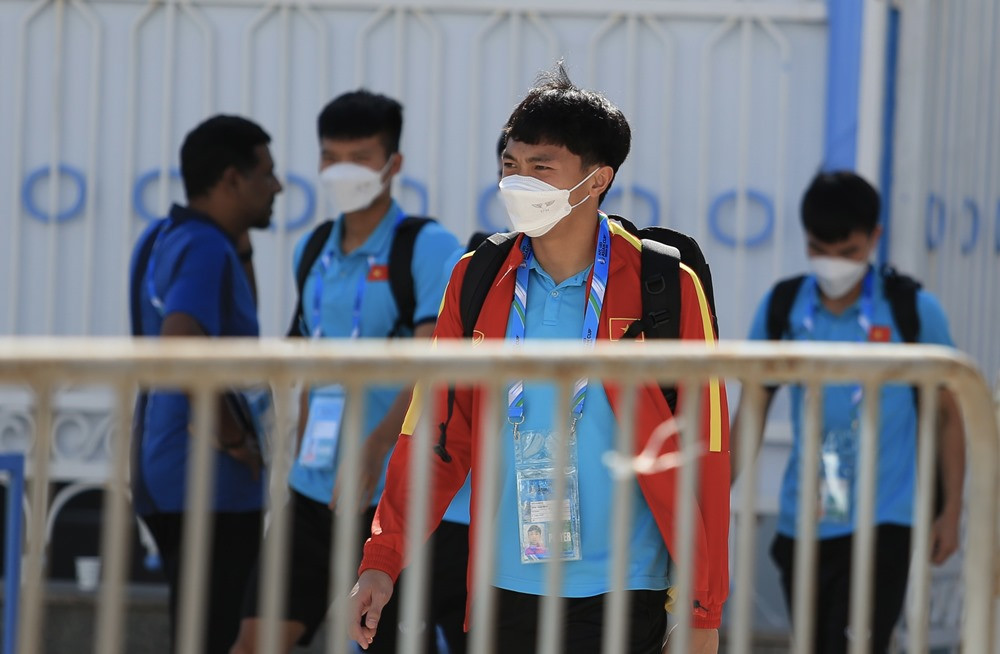 Thầy trò HLV Gong Oh Kyun đến sân chuẩn bị cho trân đấu.