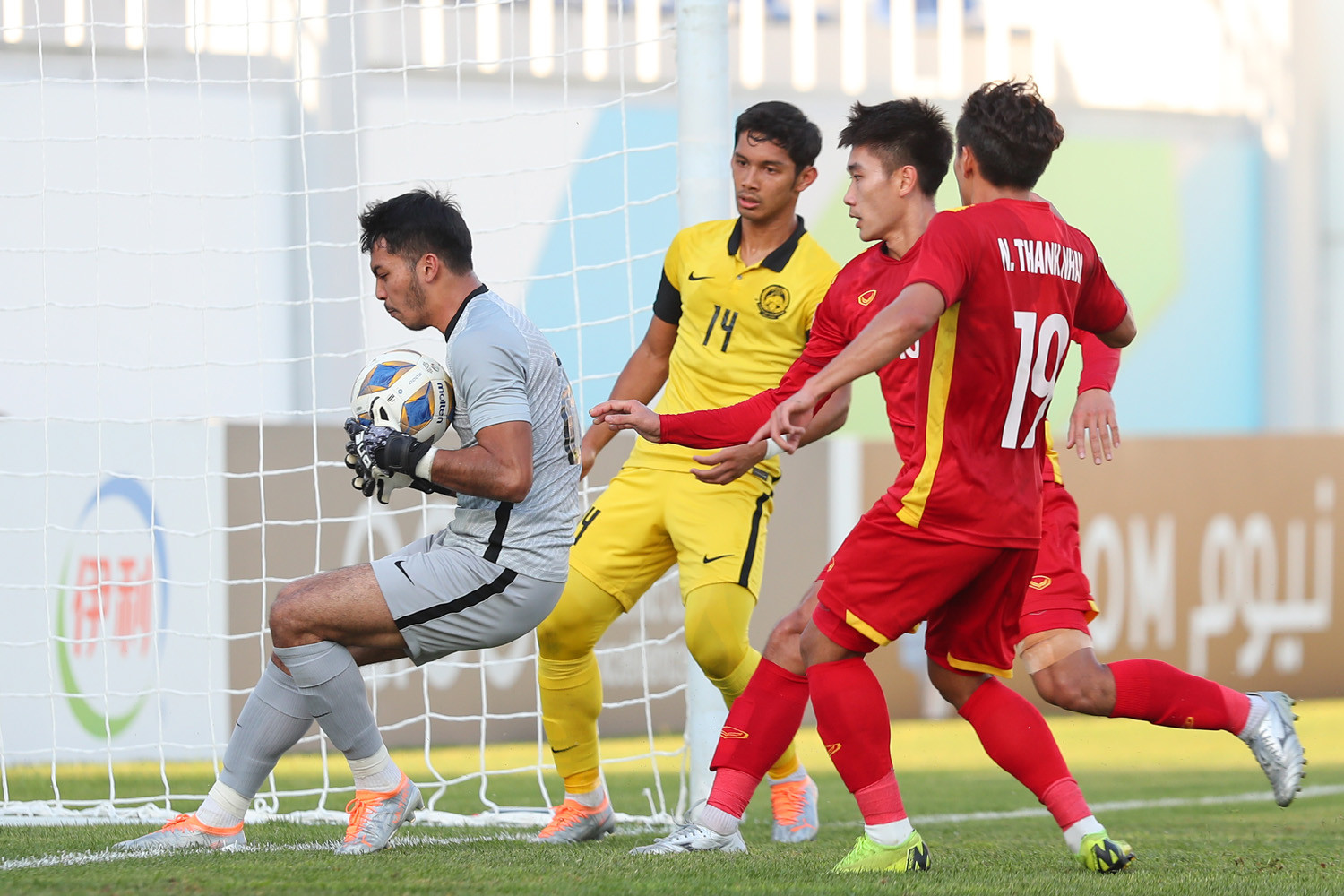 Các cầu thủ U23 Malaysia đang tổ chức phòng ngự kín kẽ khiến đội bóng áo đỏ chưa thể tìm đường vào khung thành của đối phương.