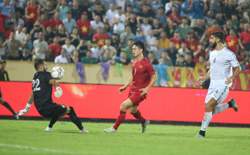 Văn Toàn đi bóng tốt độ, anh xộc thẳng vòng cấm Palestine rồi căng ngang như dọn cỗ để Tuấn Hải dễ dàng đệm bóng vào lưới trống.