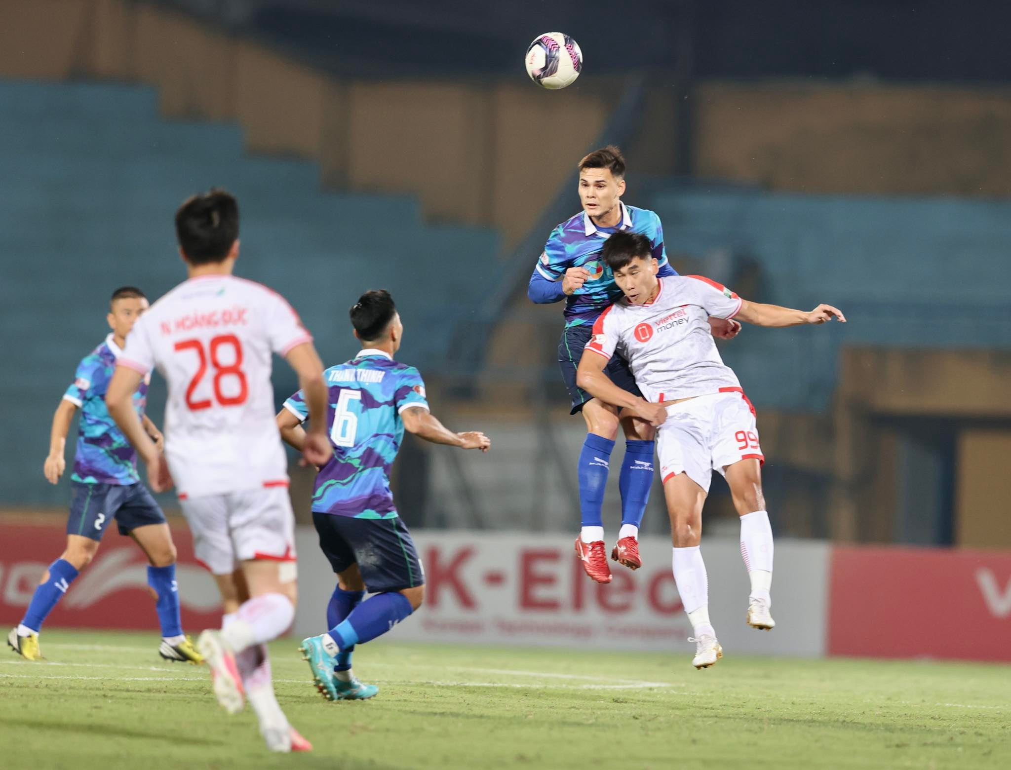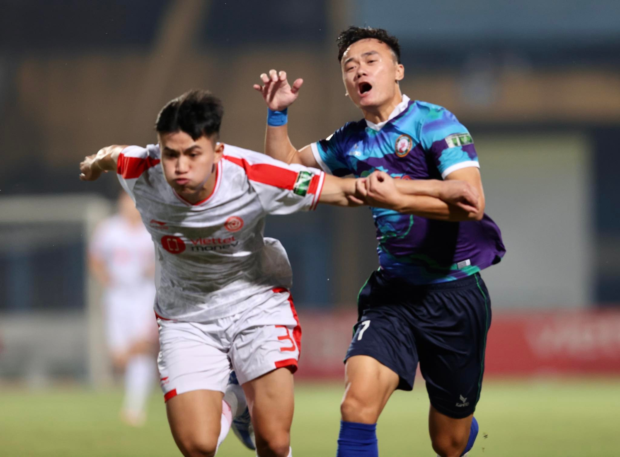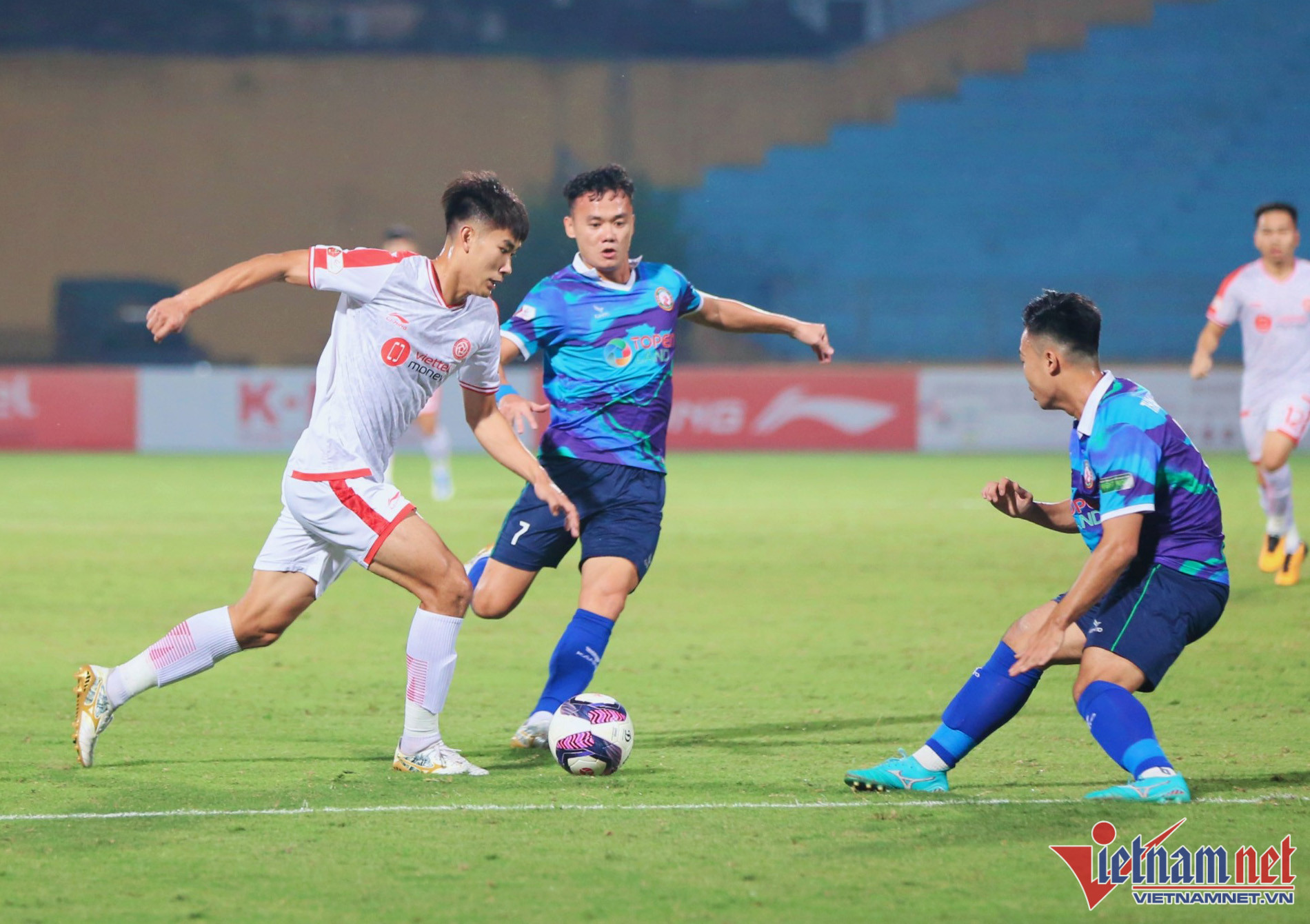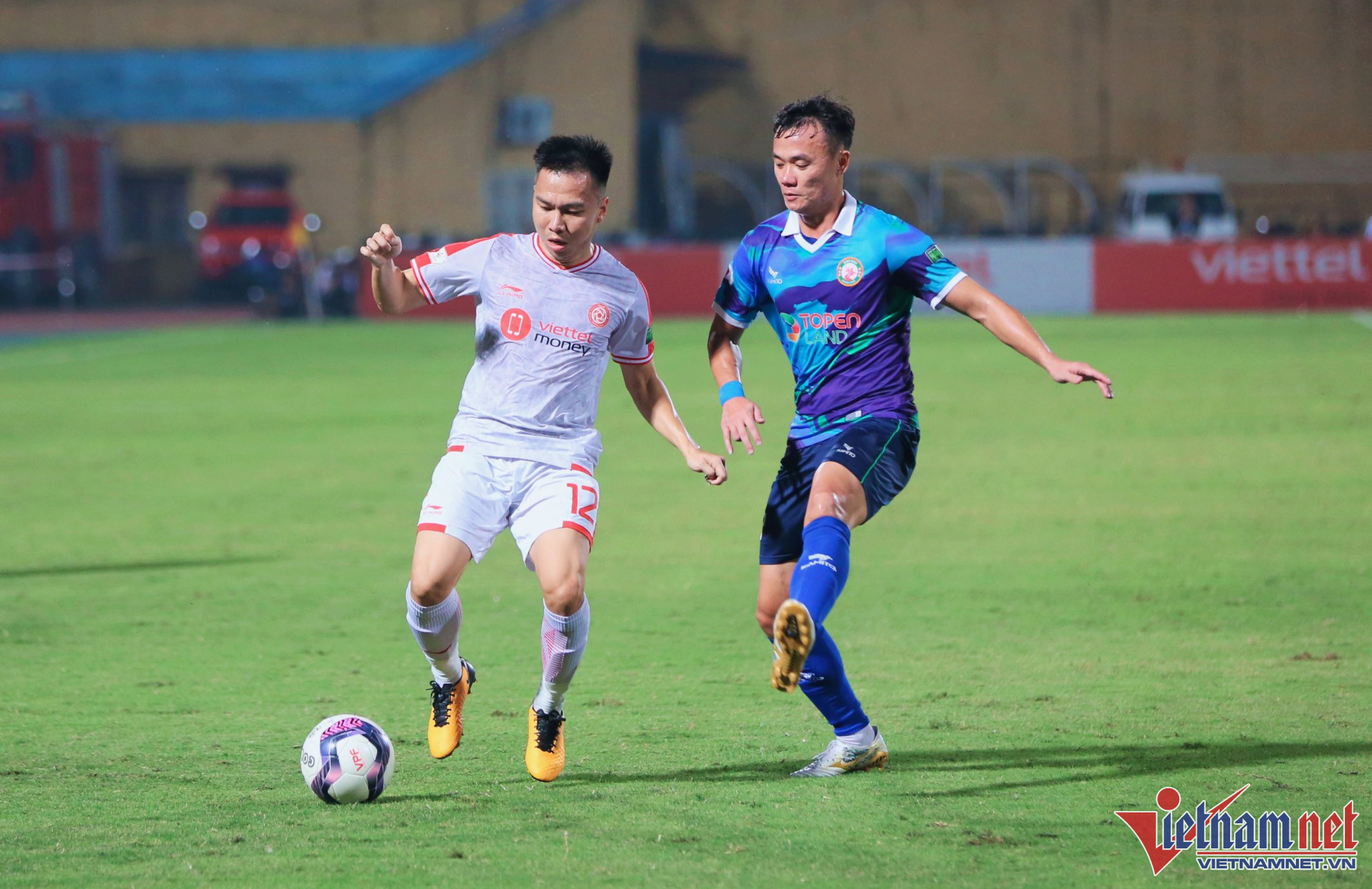 Cột dọc! Mạc Hồng Quân băng lên rất nhanh đá một chạm từ ngoài vòng cấm, Nguyên Mạnh chôn chân đứng nhìn nhưng bóng tìm đến cột dọc đội chủ nhà Viettel.