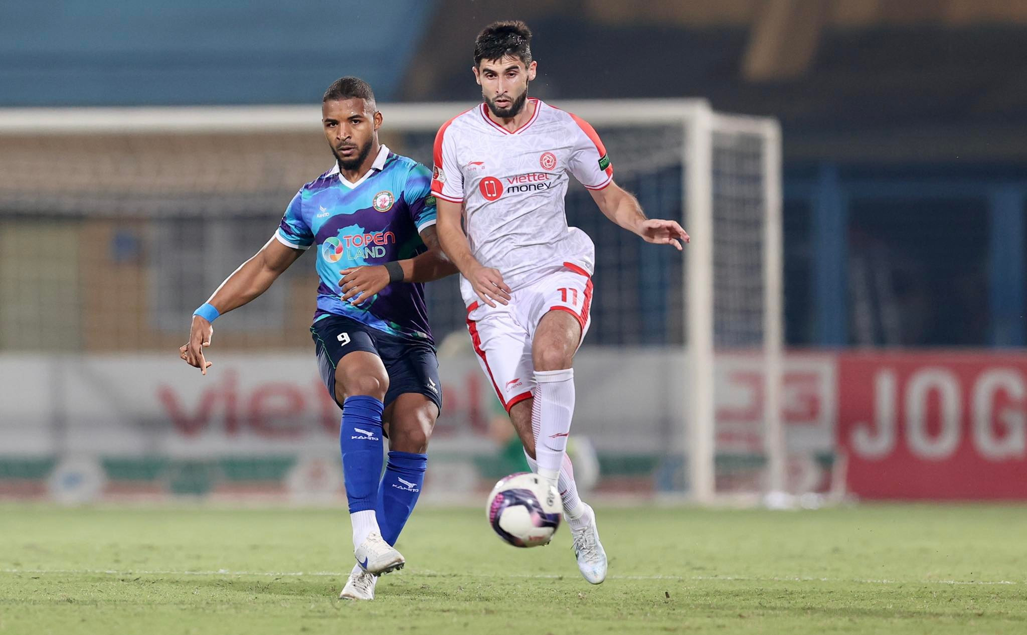 Không vào! Hendrio xử lý rất kỹ thuật giữa vòng vây cầu thủ Viettel rồi tung cú đá chân trái căng như tên bắn. Bóng đi chệch khung thành đáng tiếc, khi Nguyên Mạnh hoàn toàn bất lực.