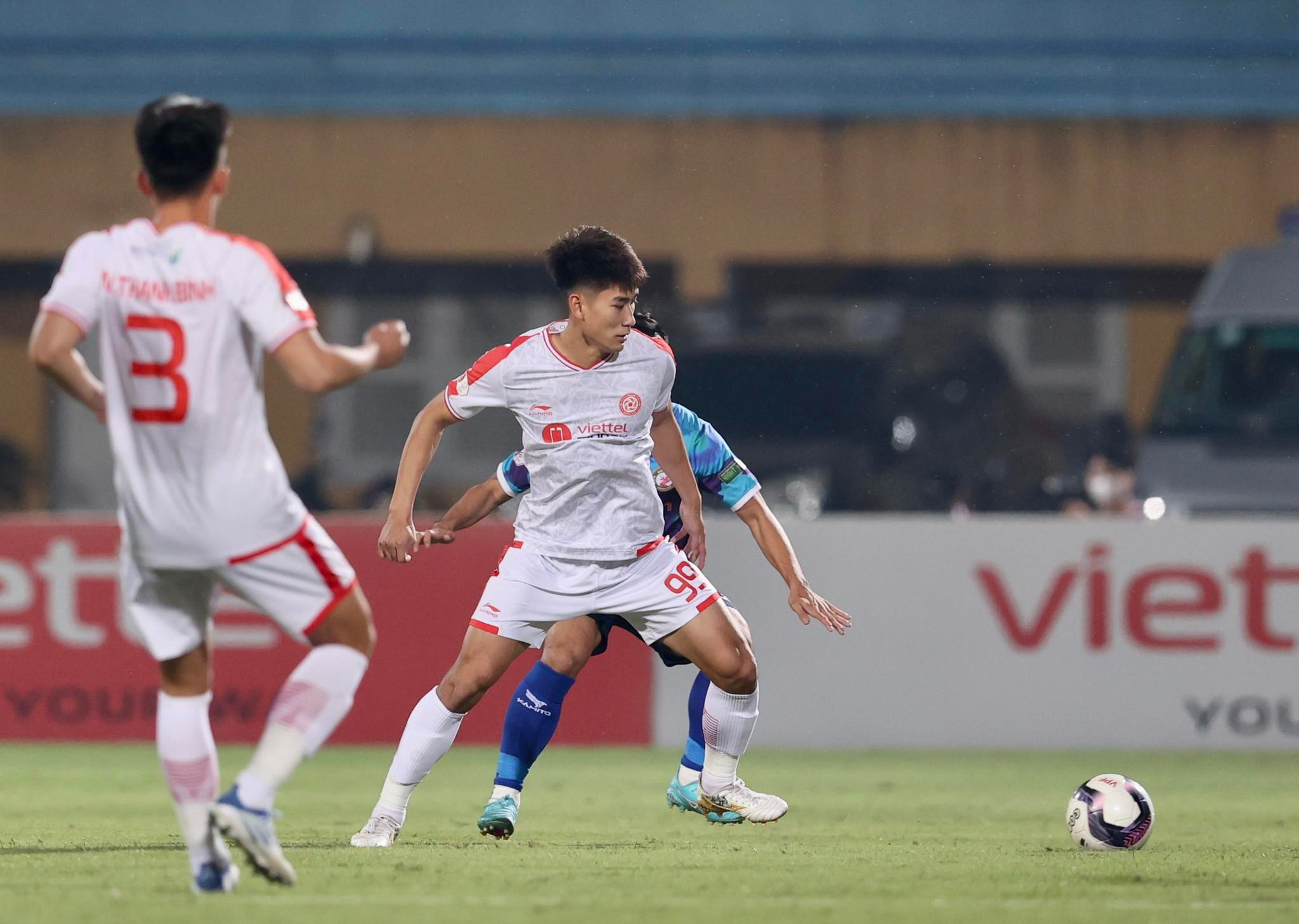 Cơ hội! Hà Đức Chinh có pha xử lý cá nhân rất táo bạo với sức mạnh và tốc độ ấn tượng vượt qua hậu vệ Viettel, nhưng cú sút chân phải của anh ở góc hẹp đi không chính xác.