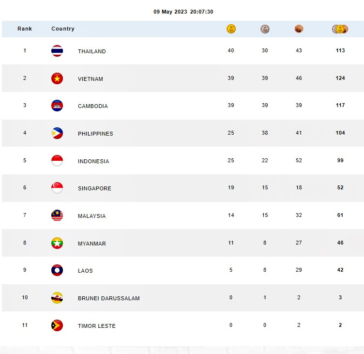 Tính hết ngày 9/5, Đoàn Thể thao Việt Nam đoạt được tổng cộng 39 HCV, 39 HCB, 46 HCĐ, tạm đứng thứ hai trên bảng tổng sắp SEA Games 32. Đoàn Thái Lan hiện đang dẫn đầu Đại hội với 40 HCV, 30 HCB, 43 HCĐ.