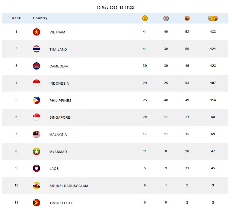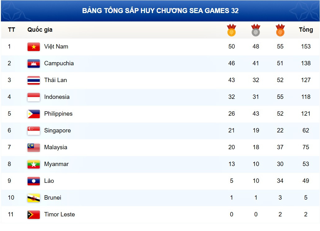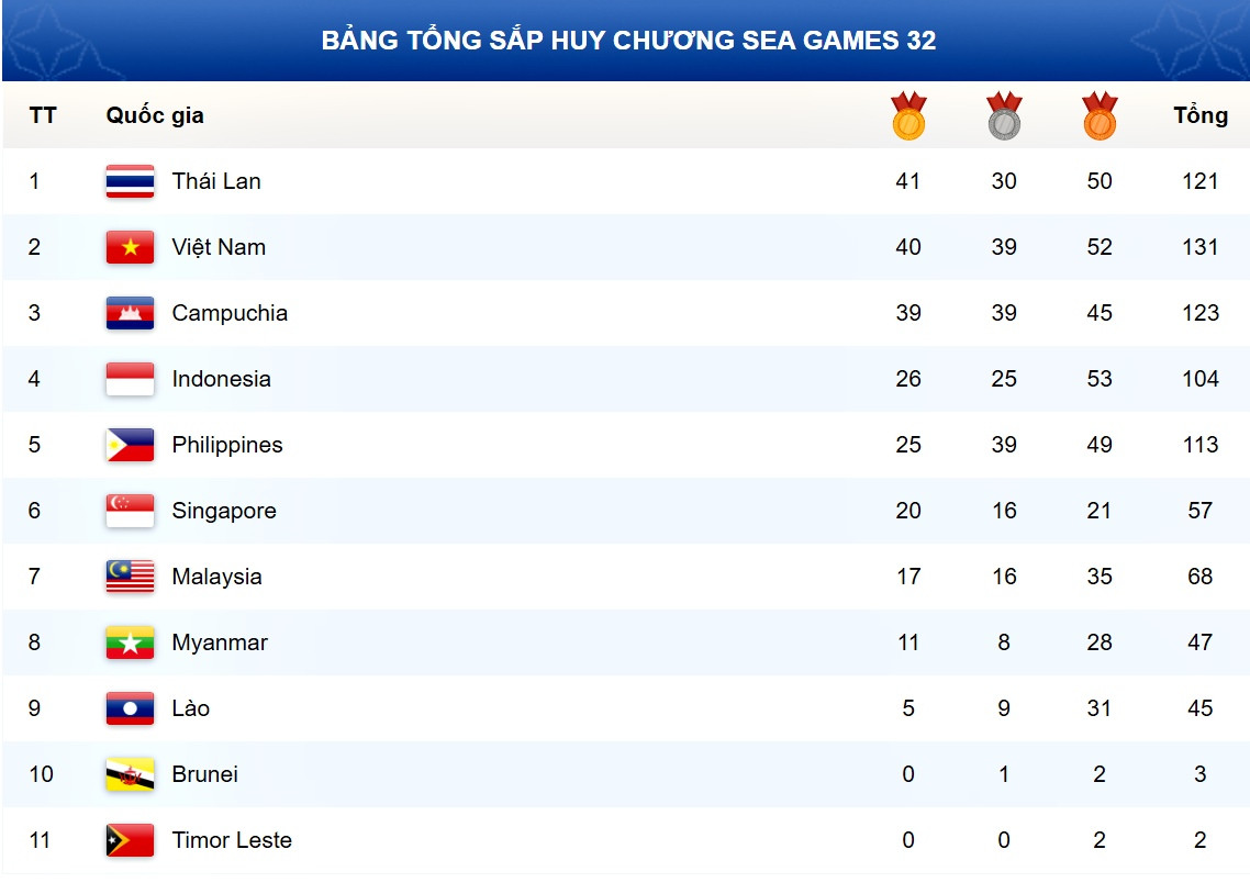 Bảng tổng sắp huy chương SEA Games 32 mới nhất
