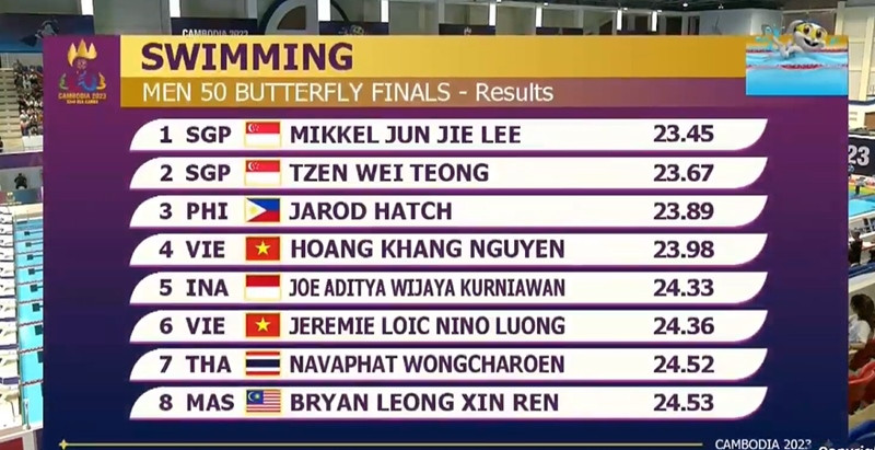 Ở chung kết nội dung 50m bướm dành cho nam, Nguyễn Hoàng Khang suýt chút nữa giành HCĐ khi về thứ 4 với thành tích 23 giây 98. Trong khi kình ngư Việt kiều Jeremie Loic Nino Lương xếp thứ 6.