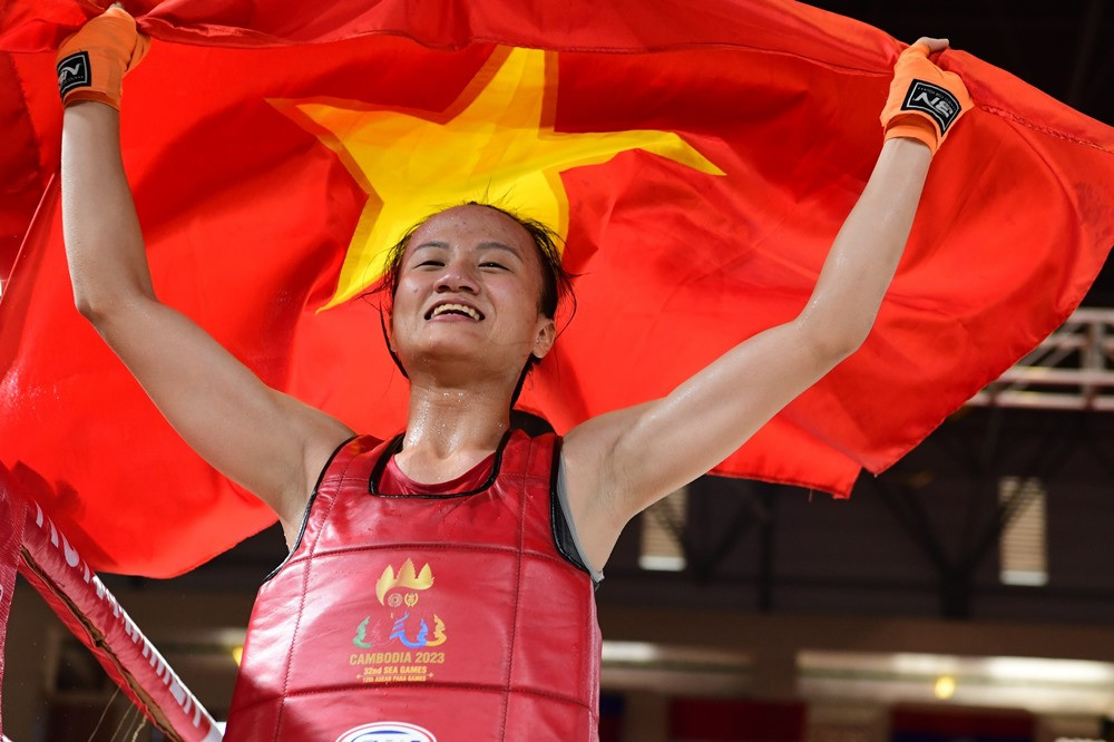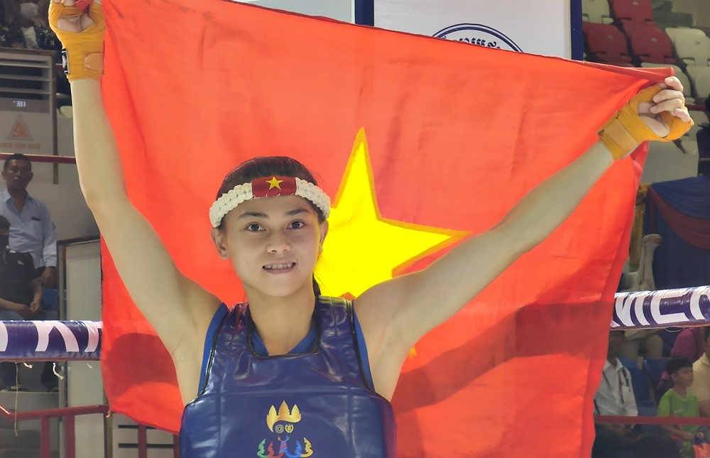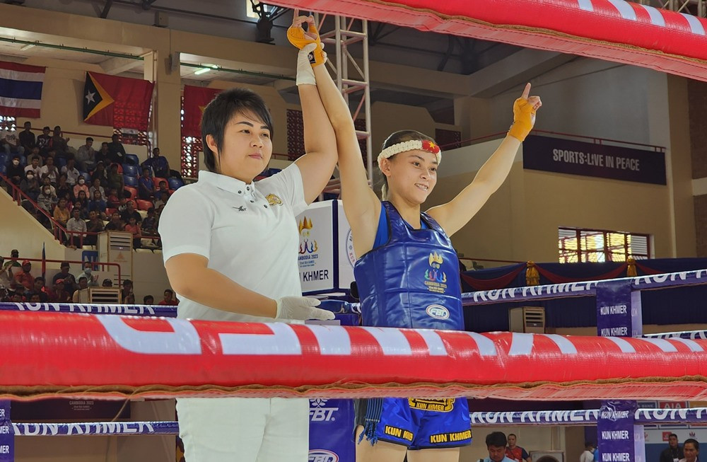 Nữ võ sĩ Tạ Thị Kim Yến đánh bại tay đấm người Myanmar trong trận chung kết hạng cân 48k để giành HCV thứ 2 cho ĐT Kun Khmer.