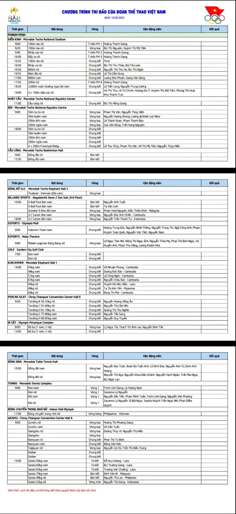 Lịch thi đấu của đoàn thể thao Việt Nam ngày 10/5