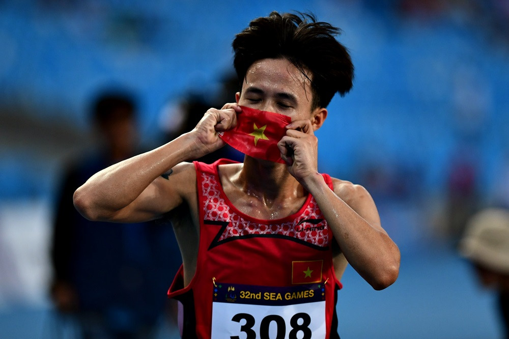 Quá sung sướng sau khi về đích, Trung Cường đã hôn lên lá quốc kỳ chuẩn bị trước đó.