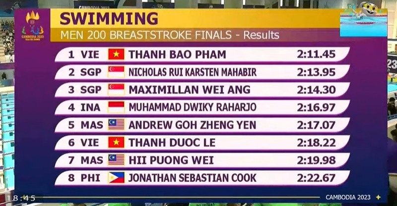 Kình ngư Phạm Thanh Bảo xuất sắc về nhất nội dung 200m ếch nam, với thành tích 2 phút 11 giây 45. Kết quả này giúp anh lập kỷ lục SEA Games mới.