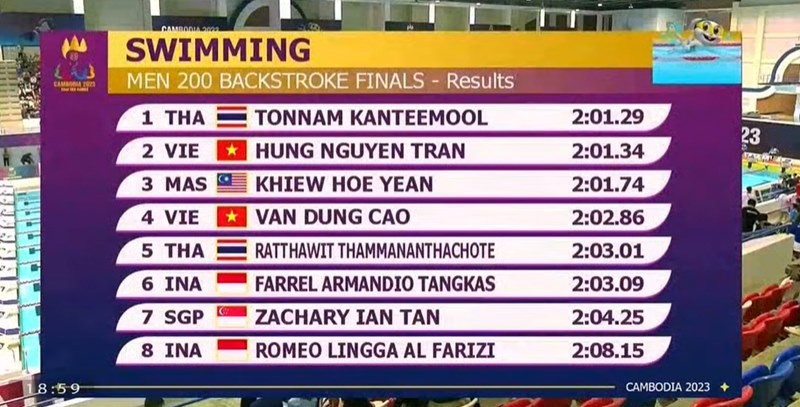 VĐV Trần Hưng Nguyên về nhất nhóm 1 vòng loại nội dung 200m ngửa nam với thời gian 2 phút 6 giây 99. Trong khi đó, Cao Văn Dũng về thứ 3 với thành tích 2 phút 9 giây 06. 2 kình ngư của Việt Nam cùng góp mặt ở chung kết, diễn ra vào chiều nay.