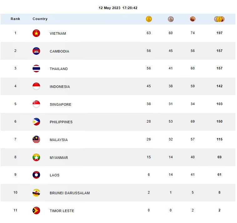 Bảng tổng sắp huy chương SEA Games 32 mới nhất