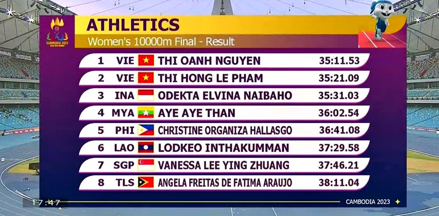 Cuối cùng chân chạy quê Bắc Giang cán đích đầu tiên, với thành tích 35 phút 11 giây 53. Hồng Lệ về thứ hai và giành HCB với thời gian 35 phút 21 giây 09. Thêm chiến thắng 1-2 nữa của thể thao Việt Nam.