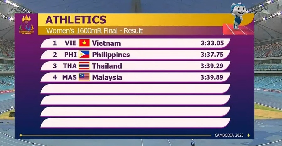 Đội chạy tiếp sức 4x400m nữ Việt Nam gồm các VĐV Nguyễn Thị Ngọc, Hoàng Thị Minh Hạnh, Nguyễn Thị Hằng và Nguyễn Thị Huyền không có đối thủ khi cán đích đầu tiên, với thành tích 3 phút 33 giây 05, trước đối thủ nặng ký Philippines và Thái Lan để giành HCV.