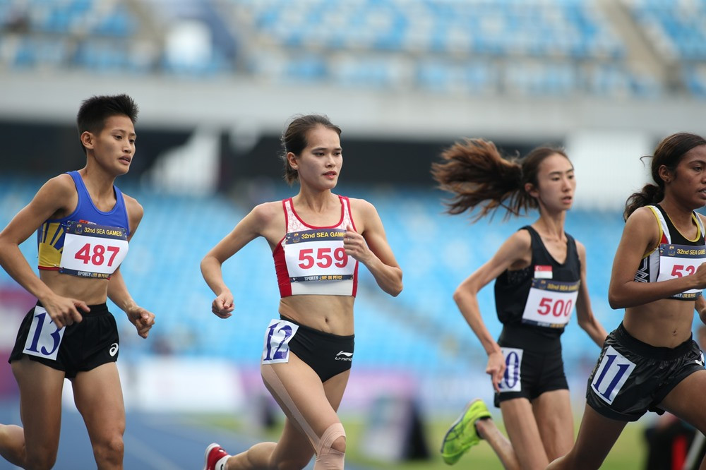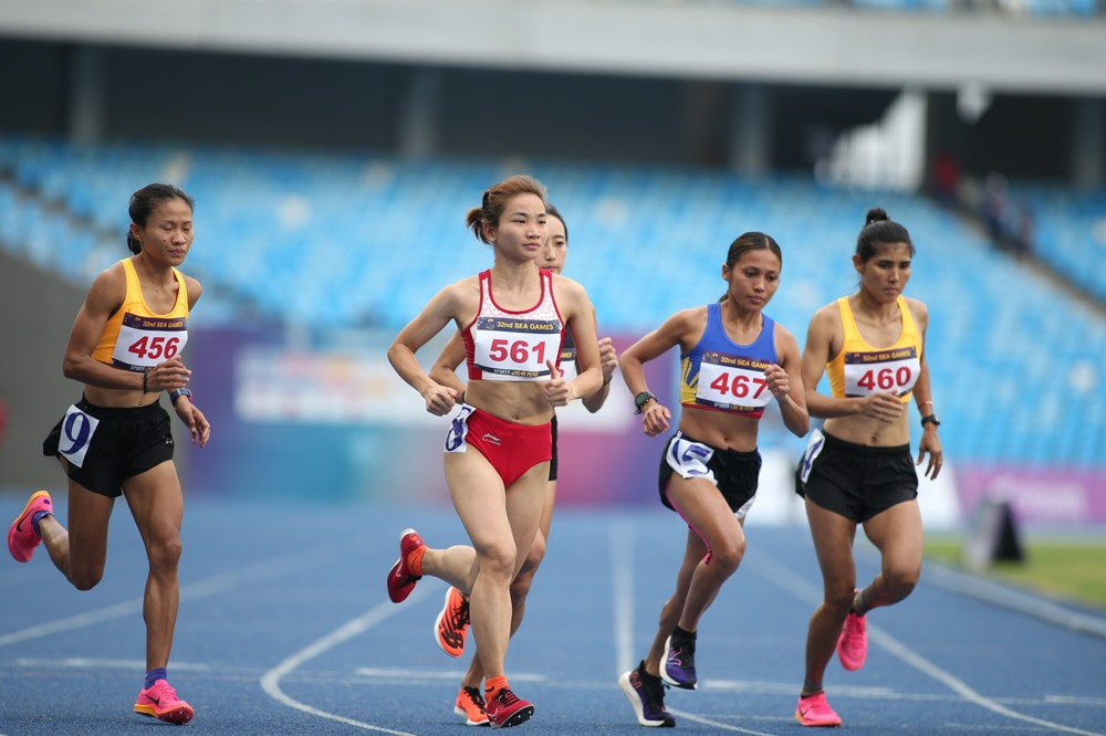 Cô gái vàng của thể thao Việt Nam Nguyễn Thị Oanh (số đeo 561) cùng ĐKVĐ Phạm Thị Hồng Lệ (số đeo 599) bắt đầu thi đấu nội dung chạy 10.000m nữ tại SEA Games 32. Ở nội dung này, có tất cả 13 VĐV tranh tài.