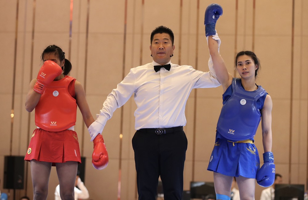 Nữ võ sĩ Nguyễn Thị Lan thắng đối thủ Myanmar trong trận chung kết tán thủ hạng cân 48kg nữ để giành HCV.