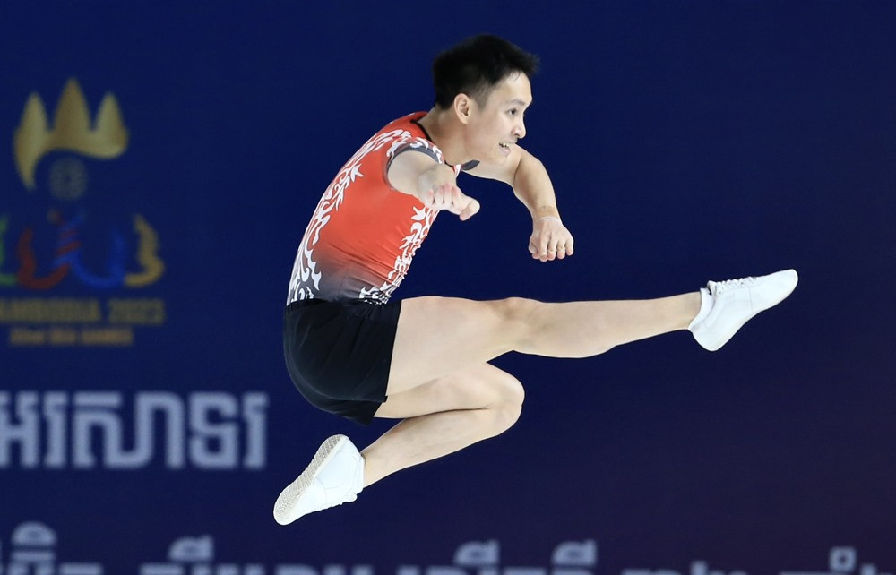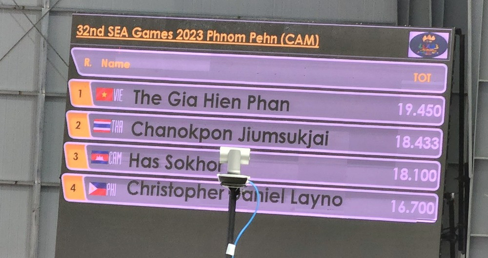 VĐV Phan Thế Gia Hiển xếp nhất với 19.450 điểm ở chung kết nội dung đơn nam aerobic để giành tấm HCV đầu tiên trong ngày hôm nay cho đoàn Việt Nam.