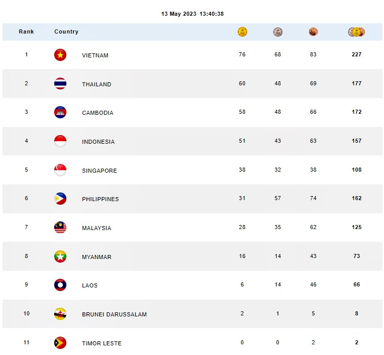 Bảng tổng sắp huy chương SEA Games 32 (tính hết ngày thi đấu 13/5)