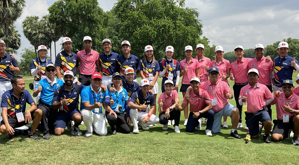 ĐT golf Việt Nam gồm Lê Khánh Hưng, Đoàn Uy, Nguyễn Đặng Minh, Nguyễn Anh Minh đang thi đấu chung kết nội dung đồng đội nam với golfer Thái Lan.