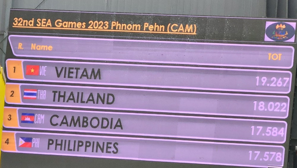 3 VĐV Hoàng Gia Bảo, Lê Hoàng Phong và Nguyễn Chế Thanh xếp trên các đội Thái Lan, Campuchia và Phlippines để giành HCV nội dung nhóm 3 người.