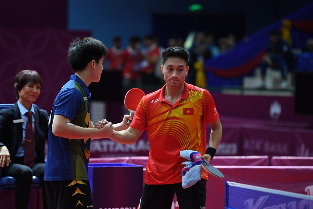 Bóng bàn Việt Nam chắc chắn có thêm tấm HCB ở nội dung đơn nam, khi Đức Tuân và Anh Tú đối đầu với nhau ở bán kết. Hai tay vợt đang thi đấu set 4, trước đó nhà ĐKVĐ quê Hải Dương để thua 3 set trước người đồng đội.