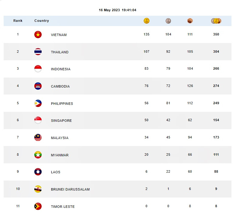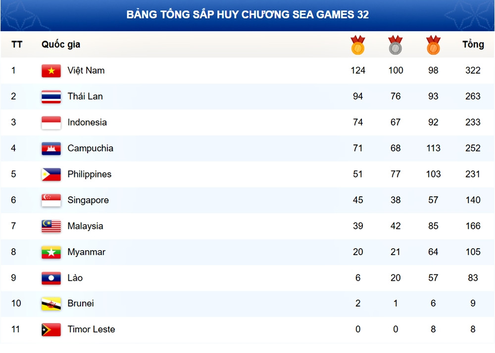 Bảng tổng sắp huy chương SEA Games 32 mới nhất