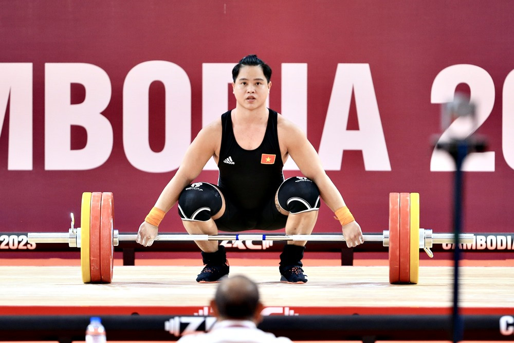 VĐV Nguyễn Quốc Toàn vừa hoàn thành phần thi cử giật ở chung kết hạng cân 89kg. Lực sĩ của Việt Nam tranh tài với 3 đối thủ đến từ Indonesia, Philippines và Timor Leste.