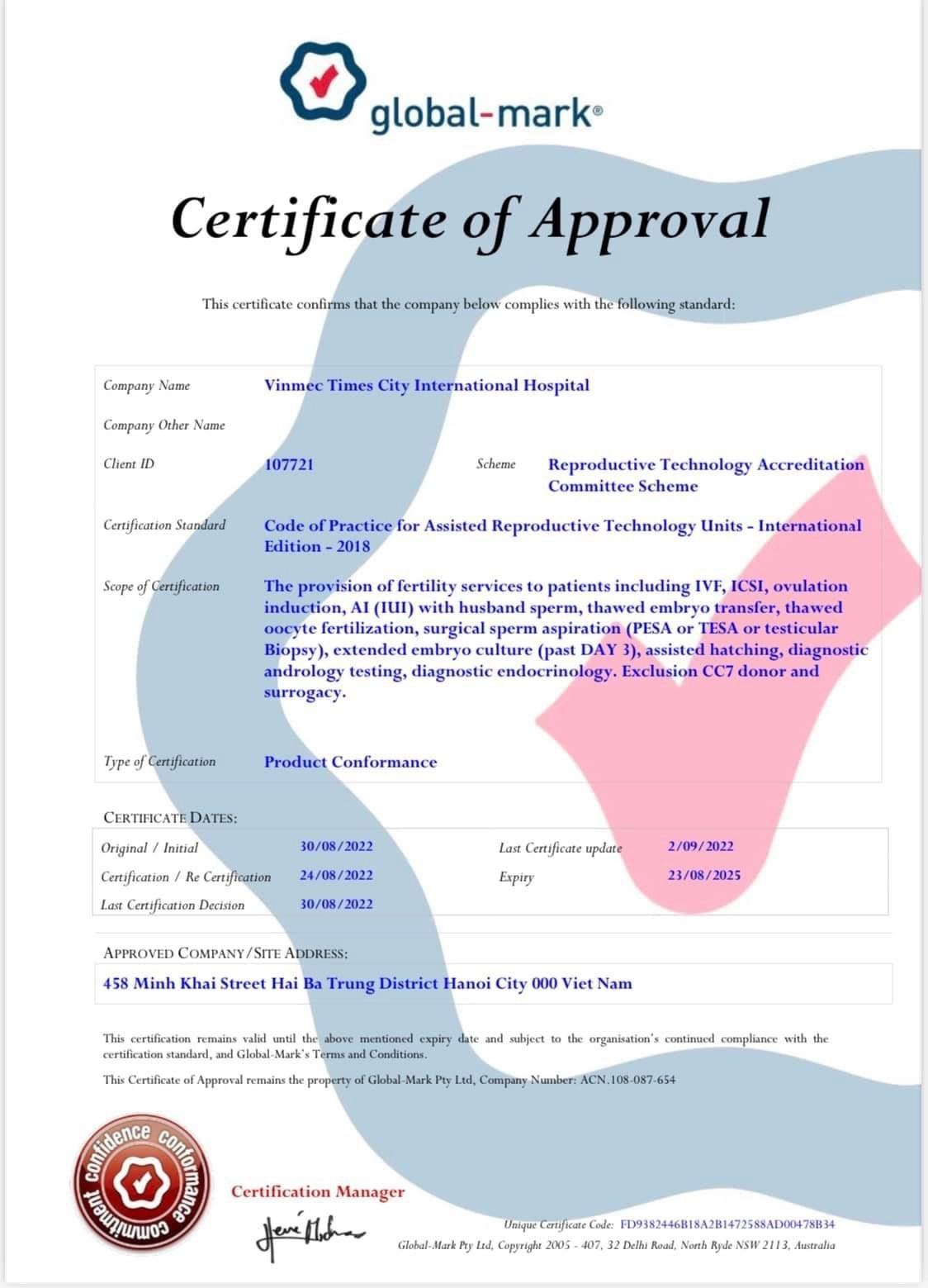 Để đạt được chứng chỉ này, trung tâm IVF thuộc Vinmec Times City đã trải qua một quá trình đánh giá khắt khe, dựa trên nền tảng phát triển vững chắc là thành quả trong suốt 8 năm, hỗ trợ sinh sản thành công cho hàng nghìn cặp vợ chồng hiếm muộn. Năm 2021, tỉ lệ có thai lâm sàng sau khi điều trị tại trung tâm đã lên đến 51,6%, tương đương với các bệnh viện lớn ở các quốc gia phát triển như Mỹ, Anh, Australia…