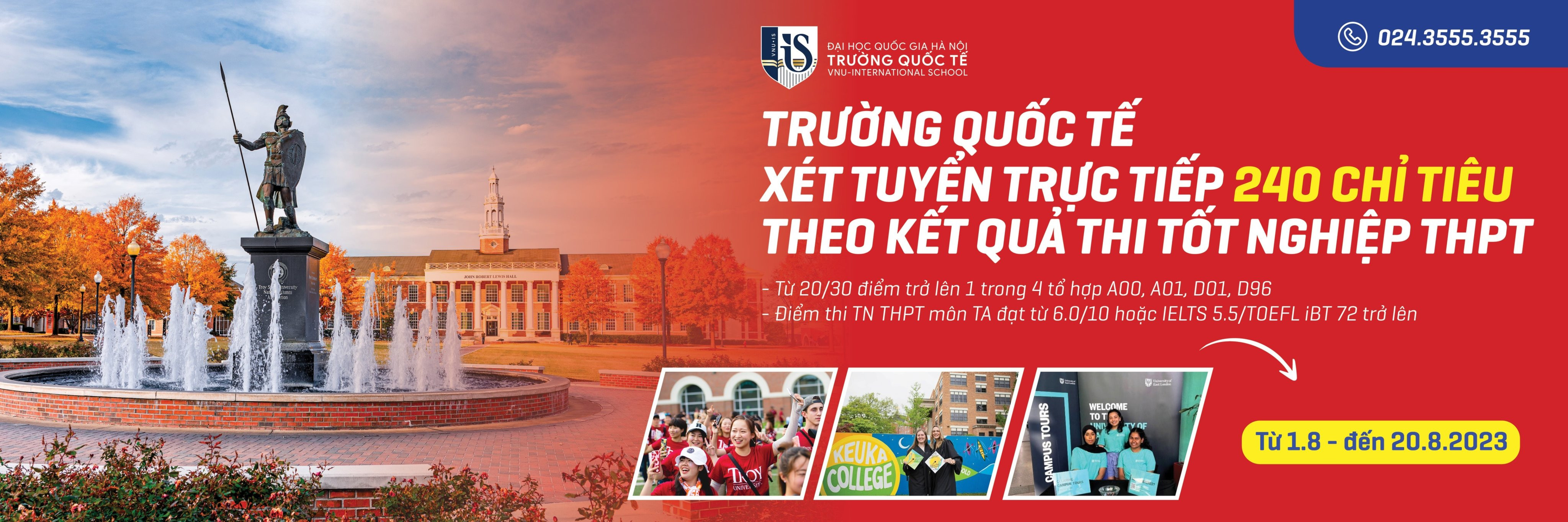 Trường Quốc tế hiện đang đào tạo 3 chương trình cử nhân liên kết với các trường đại học đối tác nước ngoài uy tín, gồm: Chương trình Quản lý do Trường Đại học Keuka (Hoa kỳ) cấp bằng; Chương trình Quản trị Khách sạn, Thể thao và Du lịch do Trường Đại học Troy (Hoa Kỳ) cấp bằng và Chương trình Kế toán và Tài chính do Trường Đại học East London (Vương quốc Anh) cấp bằng. Thông tin chi tiết về nộp hồ sơ xét tuyển xem tại đây: https://urlvn.net/tfch5u Văn phòng tuyển sinh Trường Quốc tế, ĐHQGHN: Cơ sở 1: Tầng 1, Nhà E5, Đại học Quốc gia Hà Nội, 144 Xuân Thủy, Cầu Giấy, Hà Nội. Cơ sở 2: Phòng 306, Nhà C, Làng Sinh viên HACINCO, 79 Ngụy Như Kon Tum, Nhân Chính, Thanh Xuân, Hà Nội Website: https://www.is.vnu.edu.vn/ Hotline: 024. 3555 3555/0983 372 988/ 0989 106 633/ 0379 88 44 88 Fanpage https://www.facebook.com/truongquocte.vnuis |