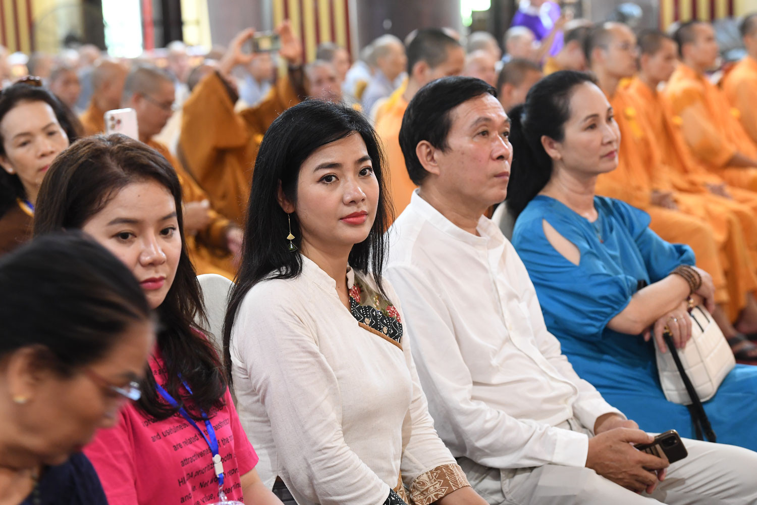 NSND Lan Hương, NSƯT Đỗ Kỷ, NSƯT Chiều Xuân, diễn viên Đàm Hằng hoan hỉ chứng kiến việc chú nguyện khai tượng Phật hoàng Trần Nhân Tông và tái khởi công chế tác bảo tượng Phật ngọc Thích Ca Mâu Ni.