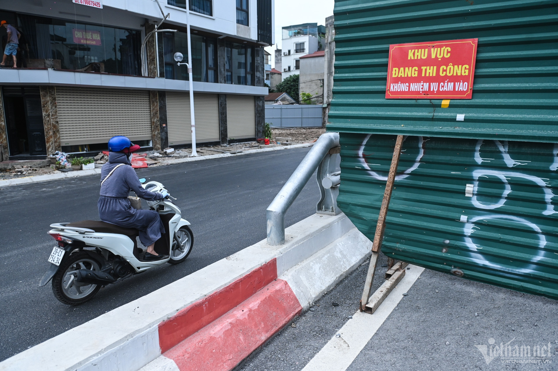Khu vực 2 đầu tuyến đường được dựng rào chắn, cắm biển báo thi công. Phía trên, đã hoàn thiện trải nhựa, lắp đặt hệ thống đèn chiếu sáng...