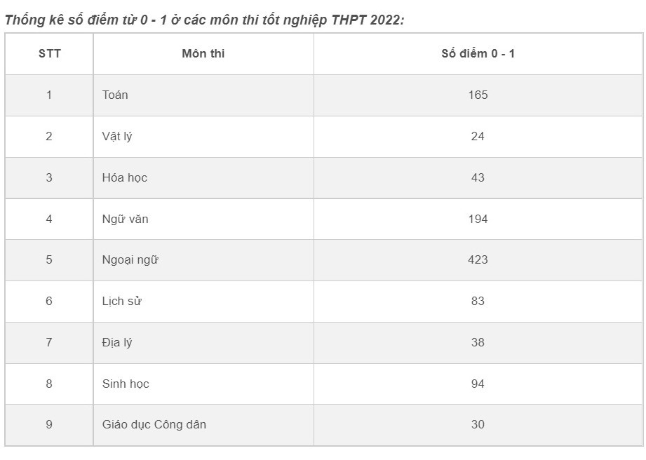Năm 2022, cả nước có 1.094 bài thi ở 9 môn thi tốt nghiệp THPT bị điểm liệt (từ 1 trở xuống). Tính từng môn, tỷ lệ điểm liệt chiếm 0,01-0,05% tổng số bài thi. Môn Tiếng Anh có số bài thi bị điểm liệt nhiều nhất với 423 bài, xếp ngay sau đó là môn Ngữ văn với 194 bài thi.
