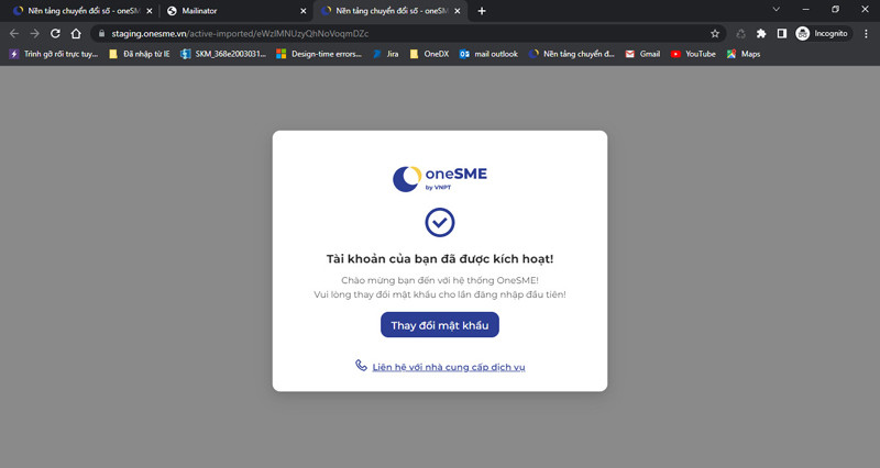 Bước 2: Click nút “Kích hoạt” để kích hoạt tài khoản. Doanh nghiệp sẽ nhận được thông báo tài khoản đã được kích hoạt và yêu cầu thay đổi mật khẩu.