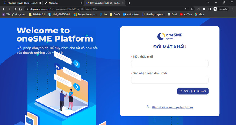 Bước 3: Sau khi ấn “Thay đổi mật khẩu”, hệ thống sẽ đưa doanh nghiệp về giao diện “Đổi mật khẩu” của oneSME để doanh nghiệp chủ động tạo mật khẩu mới.