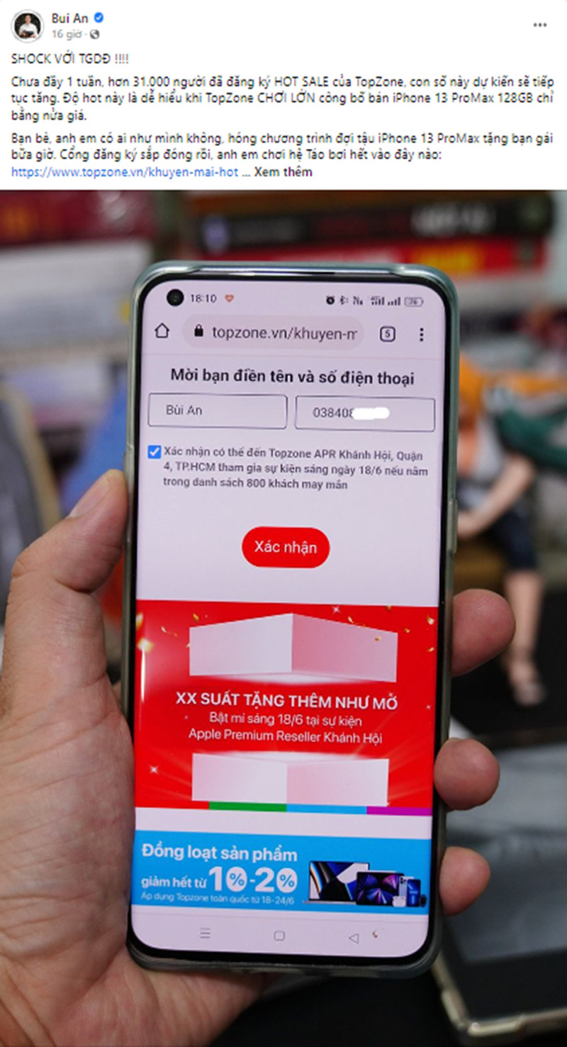 Chính bởi mang siêu phẩm ra sale nửa giá, nên sự kiện ưu đãi của TopZone đã thu hút gần 40.000 iFan tham gia tranh 100 suất mua chỉ sau một tuần. iFan nào cũng mong may mắn sẽ gọi tên mình, các reviewer công nghệ như Vinh Vật Vờ, Cu Hiệp, Bùi An… cũng đăng ký để săn giá ưu đãi.