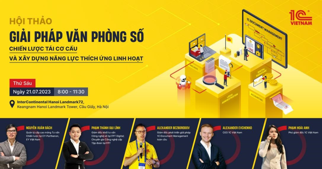 Nhằm mang tới giải pháp thiết thực trong quy trình cải thiện bộ máy của doanh nghiệp, hội thảo “Giải pháp Văn phòng số - Chiến lược tái cơ cấu doanh nghiệp và xây dựng năng lực thích ứng linh hoạt” do công ty 1C Việt Nam tổ chức vào ngày 21/7/2023 sẽ đề cập tới những câu chuyện thực tế, bài học thành công từ những chuyên gia hàng đầu về chuyển đổi số của các công ty lớn như: EY Parthenon, FPT Digital, những chuyên gia nghiên cứu và phát triển giải pháp Văn phòng số toàn cầu.