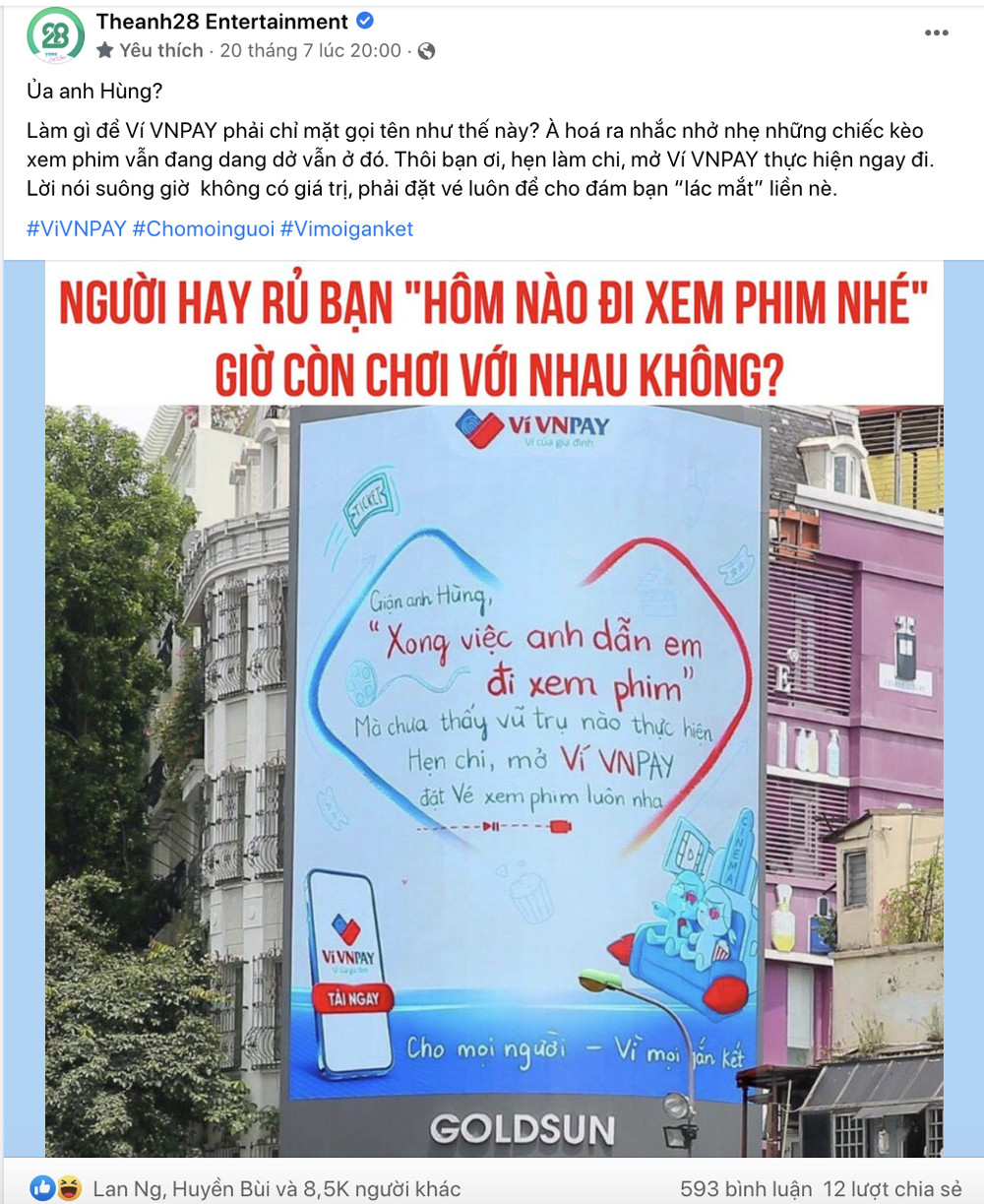 Rạp chiếu phim cũng là một trong những điểm hẹn “hàn gắn" tình cảm lý tưởng, đặc biệt với những hội nhóm, cặp đôi “ghiền" phim điện ảnh. Từ nay tới 28/08, chương trình “Ví VNPAY tặng 1 triệu voucher gắn kết" cũng dành ưu đãi tới 100.000 đồng khi đặt vé xem phim trên ứng dụng ví.