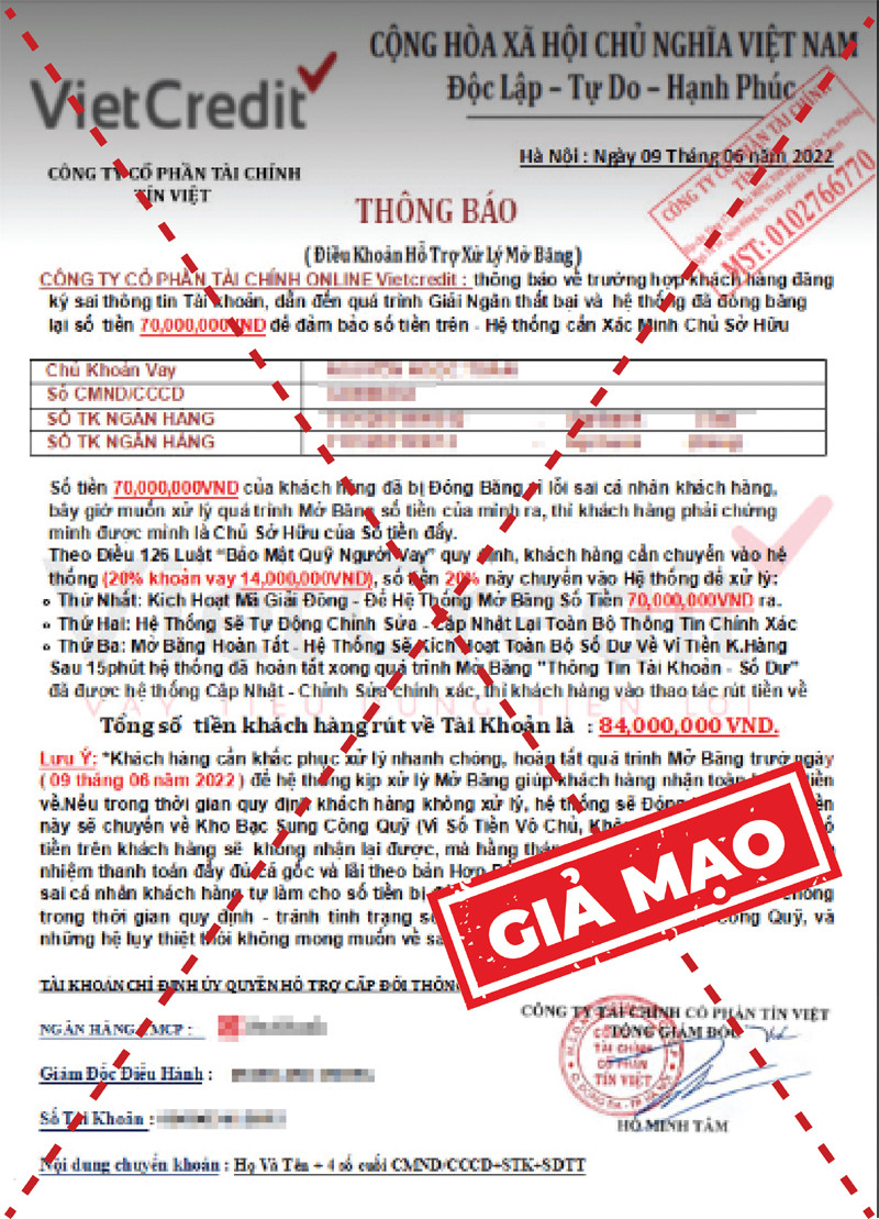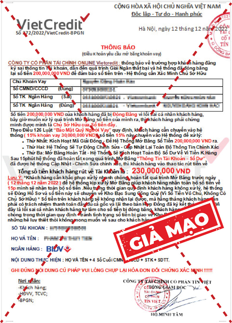 Sau đó, kẻ gian tiếp cận, trao đổi, mời khách hàng cung cấp thông tin cá nhân như số CCCD/CMND/Sổ hộ khẩu… để hoàn thành thủ tục, hồ sơ vay vốn. Để tạo niềm tin cho khách hàng, kẻ gian còn giả mạo các văn bản có con dấu, chữ ký của người có thẩm quyền tại VietCredit, chứng minh là khách hàng đã được giải ngân khoản vay thông qua một ngân hàng khác. Tiếp theo, đối tượng sẽ thông báo lỗi giải ngân và yêu cầu nộp tiền để xử lý khoản vay, hứa hoàn trả lại khi giải ngân xong. Thực tế sau khi khách hàng nộp tiền xong sẽ không nhận được bất kỳ khoản tiền giải ngân nào và mất toàn bộ số tiền đã nộp theo yêu cầu.