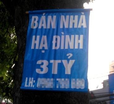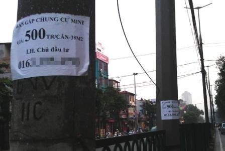 Dọc các tuyến phố lớn, đến ngõ hẻm, khu dân cư, hàng loạt tờ rơi rao vặt mua bán nhà đất, chung cư, đất dự án được dán chi chít trên tường, cột điện, gốc cây, cả nắp cống,… Hoành tráng hơn, nhiều ông chủ lớn còn thuê cả băng rôn, áp phích dự án treo cột điện với nhiều nội dung như: “cơ hội sở căn hộ cao cấp giá chỉ 1 tỷ đồng”, “Ưu đãi mua nhà”, “Nhà ở ngay giá 500 triệu đồng”…
