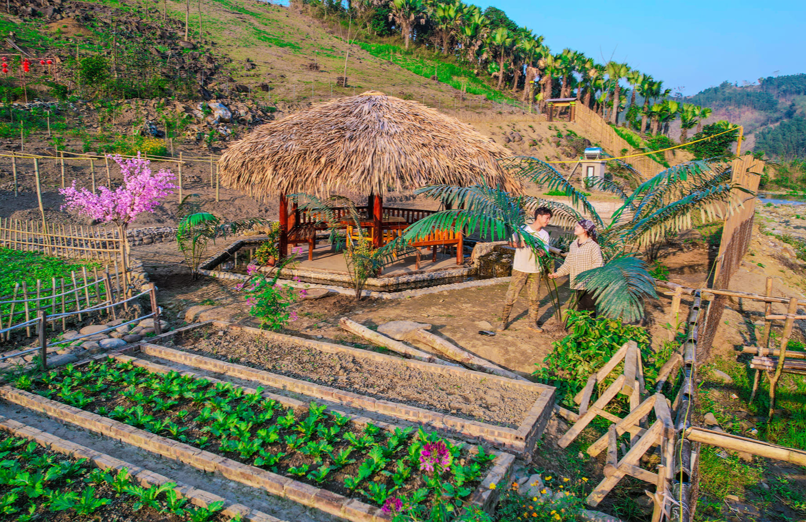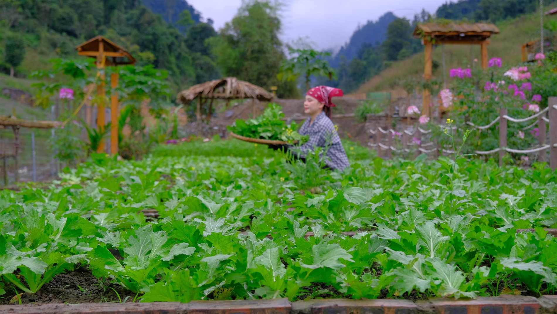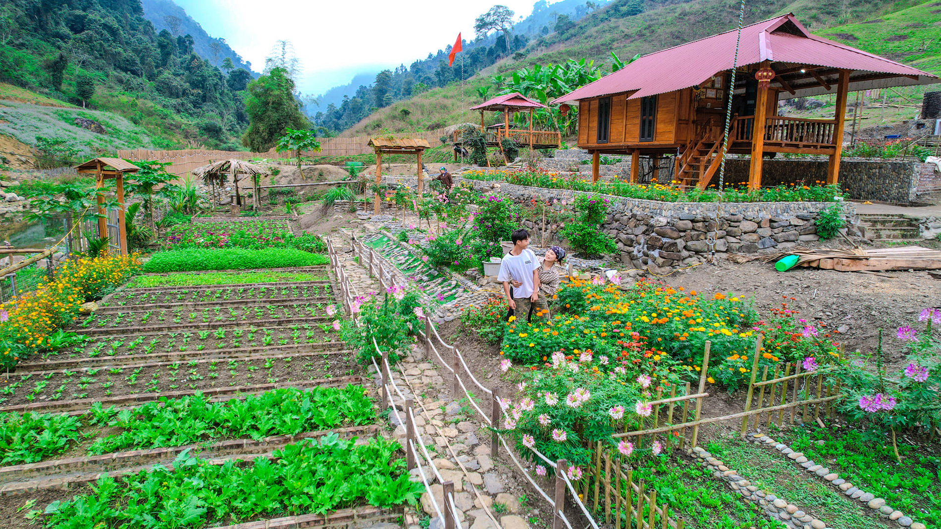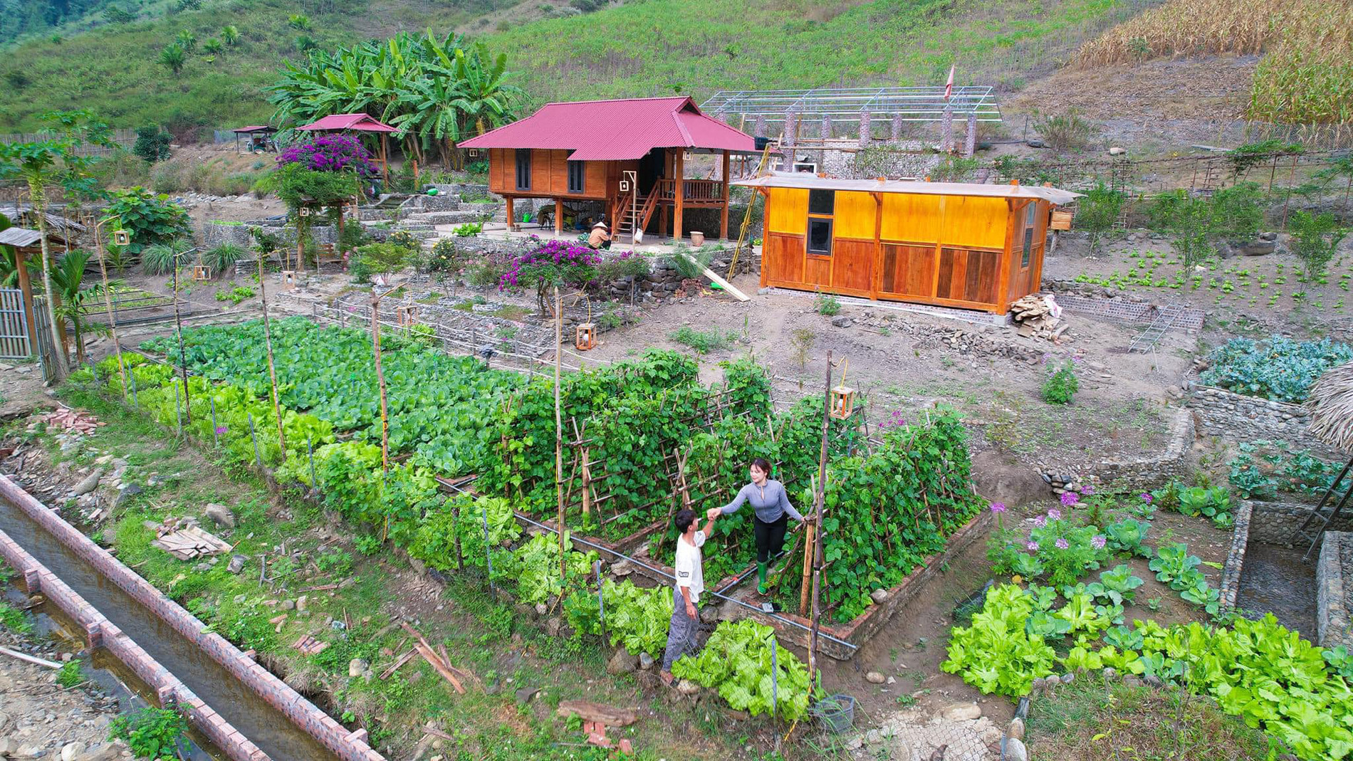 Giữa ngọn đồi bạt ngàn của 1 huyện miền núi phía đông tỉnh Sơn La, khu nhà vườn tràn ngập các loại rau, trái và hoa của đôi vợ chồng người Mường càng thêm nổi bật.