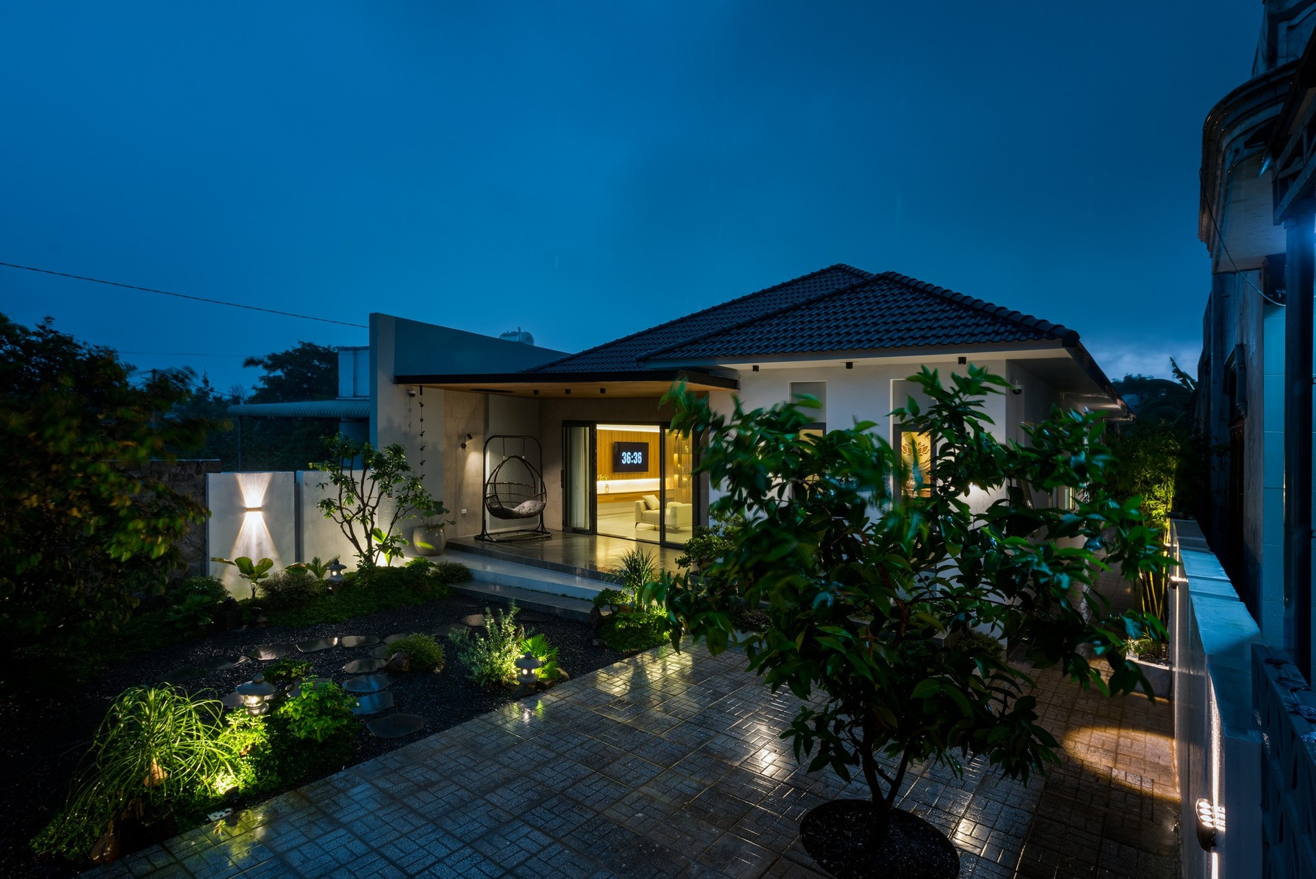 Công trình có quy mô 1 tầng, gồm 3 phòng ngủ, không gian sinh hoạt chung với phòng khách, bếp và phòng ăn liên thông. Diện tích xây dựng khoảng 200m2, phần còn lại dành cho sân vườn rộng rãi, thoáng mát.